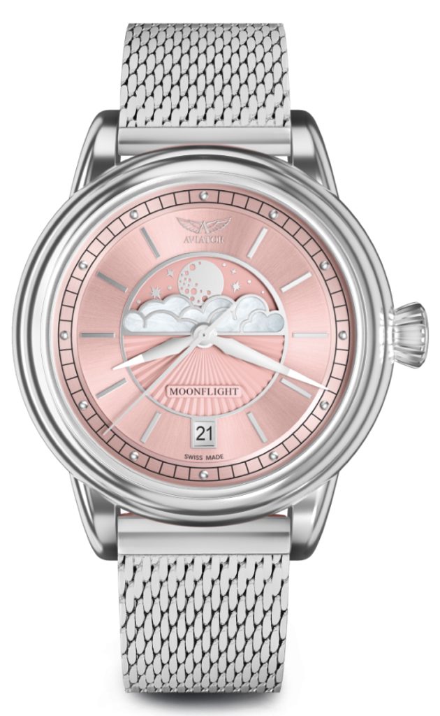 Zlatý vek letectva priniesol do cestovania novú úroveň sofistikovanosti. Módni návrhári vniesli extravaganciu a umenie do dizajnu oceľových uniforiem lietadiel a palubného personálu. Nočné lety na palube lietadla Douglas DC-3 ponúkali luxusné vybavenie a veľkolepú mystiku mesiaca za oknami - od západu do východu slnka. Inšpirovaný touto érou luxusu a tajomným pôvabom mesiaca prináša Aviator MoonFlight eleganciu na dosah ruky. Farebná paleta, lesklé hladké povrchy a slnečné giloše sú skutočne veľmi podobné 30. rokom minulého storočia. Obláčiky z čistej perlete evokujú krásnu jednoduchosť s nádychom flapper módy, zatiaľ čo fascinujúci disk s fázami mesiaca zachytáva nočnú oblohu tak, ako žiarila pred mnohými mesiacmi a bude svietiť aj naďalej.