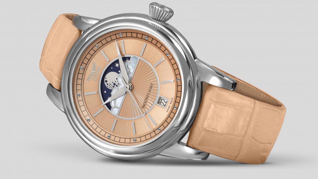 Zlatý vek letectva priniesol do cestovania novú úroveň sofistikovanosti. Módni návrhári vniesli extravaganciu a umenie do dizajnu oceľových uniforiem lietadiel a palubného personálu. Nočné lety na palube lietadla Douglas DC-3 ponúkali luxusné vybavenie a veľkolepú mystiku mesiaca za oknami - od západu do východu slnka. Inšpirovaný touto érou luxusu a tajomným pôvabom mesiaca prináša Aviator MoonFlight eleganciu na dosah ruky. Farebná paleta, lesklé hladké povrchy a slnečné giloše sú skutočne veľmi podobné 30. rokom minulého storočia. Obláčiky z čistej perlete evokujú krásnu jednoduchosť s nádychom flapper módy, zatiaľ čo fascinujúci disk s fázami mesiaca zachytáva nočnú oblohu tak, ako žiarila pred mnohými mesiacmi a bude svietiť aj naďalej.