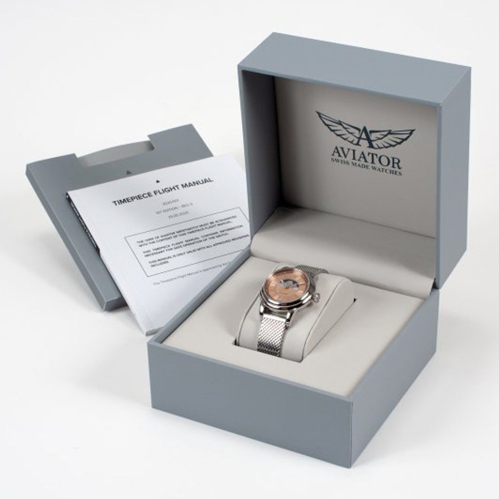 Zlatý vek letectva priniesol do cestovania novú úroveň sofistikovanosti. Módni návrhári vniesli extravaganciu a umenie do dizajnu oceľových uniforiem lietadiel a palubného personálu. Nočné lety na palube lietadla Douglas DC-3 ponúkali luxusné vybavenie a veľkolepú mystiku mesiaca za oknami - od západu do východu slnka. Inšpirovaný touto érou luxusu a tajomným pôvabom mesiaca prináša Aviator MoonFlight eleganciu na dosah ruky. Farebná paleta, lesklé hladké povrchy a slnečné giloše sú skutočne veľmi podobné 30. rokom minulého storočia. Obláčiky z čistej perlete evokujú krásnu jednoduchosť s nádychom flapper módy, zatiaľ čo fascinujúci disk s fázami mesiaca zachytáva nočnú oblohu tak, ako žiarila pred mnohými mesiacmi a bude svietiť aj naďalej.