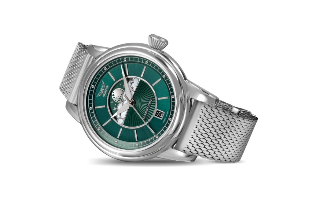 Zlatý vek letectva priniesol do cestovania novú úroveň sofistikovanosti. Módni návrhári vniesli extravaganciu a umenie do dizajnu oceľových uniforiem lietadiel a palubného personálu. Nočné lety na palube lietadla Douglas DC-3 ponúkali luxusné vybavenie a veľkolepú mystiku mesiaca za oknami - od západu do východu slnka. Inšpirovaný touto érou luxusu a tajomným pôvabom mesiaca prináša Aviator MoonFlight eleganciu na dosah ruky. Farebná paleta, lesklé hladké povrchy a slnečné giloše sú skutočne veľmi podobné 30. rokom minulého storočia. Obláčiky z čistej perlete evokujú krásnu jednoduchosť s nádychom flapper módy, zatiaľ čo fascinujúci disk s fázami mesiaca zachytáva nočnú oblohu tak, ako žiarila pred mnohými mesiacmi a bude svietiť aj naďalej.