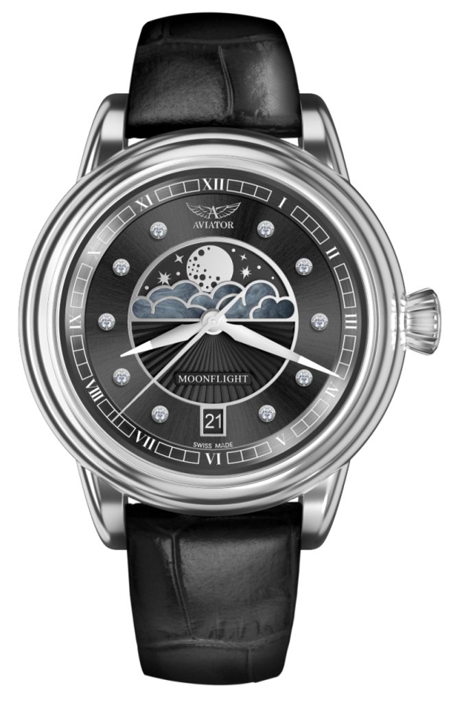 Zlatý vek letectva priniesol do cestovania novú úroveň sofistikovanosti. Módni návrhári vniesli extravaganciu a umenie do dizajnu oceľových uniforiem lietadiel a palubného personálu. Nočné lety na palube lietadla Douglas DC-3 ponúkali luxusné vybavenie a veľkolepú mystiku mesiaca za oknami - od západu do východu slnka. Inšpirovaný touto érou luxusu a tajomným pôvabom mesiaca prináša Aviator MoonFlight eleganciu na dosah ruky. Farebná paleta, lesklé hladké povrchy a slnečné giloše sú skutočne veľmi podobné 30. rokom minulého storočia. Obláčiky z čistej perlete evokujú krásnu jednoduchosť s nádychom flapper módy, zatiaľ čo fascinujúci disk s fázami mesiaca zachytáva nočnú oblohu tak, ako žiarila pred mnohými mesiacmi a bude svietiť aj naďalej.