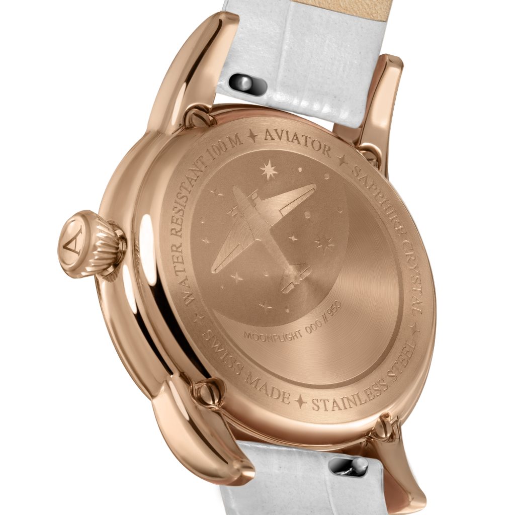 Zlatý vek letectva priniesol do cestovania novú úroveň sofistikovanosti. Módni návrhári vniesli extravaganciu a umenie do dizajnu oceľových uniforiem lietadiel a palubného personálu. Nočné lety na palube lietadla Douglas DC-3 ponúkali luxusné vybavenie a veľkolepú mystiku mesiaca za oknami - od západu do východu slnka. Inšpirovaný touto érou luxusu a tajomným pôvabom mesiaca prináša Aviator MoonFlight eleganciu na dosah ruky. Farebná paleta, lesklé hladké povrchy a slnečné giloše sú skutočne veľmi podobné 30. rokom minulého storočia. Obláčiky z čistej perlete evokujú krásnu jednoduchosť s nádychom flapper módy, zatiaľ čo fascinujúci disk s fázami mesiaca zachytáva nočnú oblohu tak, ako žiarila pred mnohými mesiacmi a bude svietiť aj naďalej.