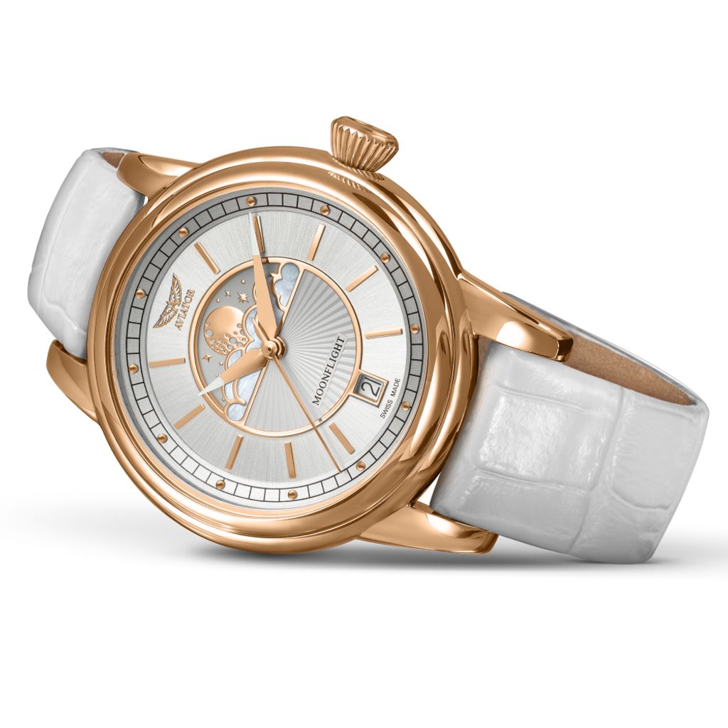 O vplyve Mesiaca na našu Zem a všetok život na nej už nikto nepochybuje. Ovplyvňuje náš spánok a naše myslenie alebo vzostup a pokles oceánov a morí. Počas 8 fáz, ktorými Mesiac prechádza každých 29,5 dňa, sa intenzita jeho sily mení. Dámske hodinky Aviator Moonflightsú navrhnuté tak, aby ste tieto fázy mohli kedykoľvek sledovať pohľadom na hodinky.
