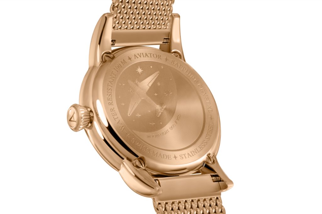 Zlatý vek letectva priniesol do cestovania novú úroveň sofistikovanosti. Módni návrhári vniesli extravaganciu a umenie do dizajnu oceľových uniforiem lietadiel a palubného personálu. Nočné lety na palube lietadla Douglas DC-3 ponúkali luxusné vybavenie a veľkolepú mystiku mesiaca za oknami - od západu do východu slnka. Inšpirovaný touto érou luxusu a tajomným pôvabom mesiaca prináša Aviator MoonFlight eleganciu na dosah ruky. Farebná paleta, lesklé hladké povrchy a slnečné giloše sú skutočne veľmi podobné 30. rokom minulého storočia. Obláčiky z čistej perlete evokujú krásnu jednoduchosť s nádychom flapper módy, zatiaľ čo fascinujúci disk s fázami mesiaca zachytáva nočnú oblohu tak, ako žiarila pred mnohými mesiacmi a bude svietiť aj naďalej.