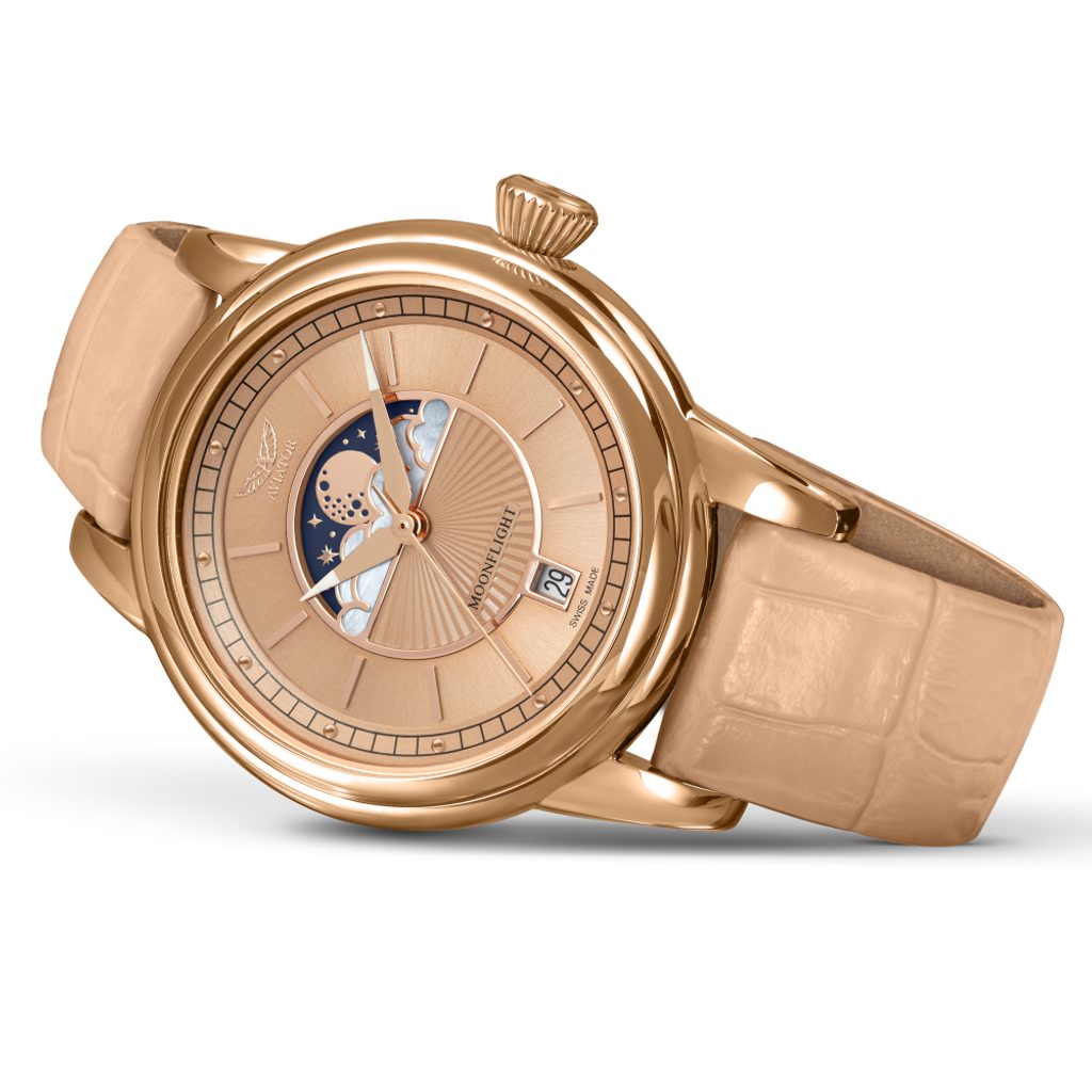 O vplyve Mesiaca na našu Zem a všetok život na nej už nikto nepochybuje. Ovplyvňuje náš spánok a naše myslenie alebo vzostup a pokles oceánov a morí. Počas 8 fáz, ktorými Mesiac prechádza každých 29,5 dňa, sa intenzita jeho sily mení. Dámske hodinky Aviator Moonflightsú navrhnuté tak, aby ste tieto fázy mohli kedykoľvek sledovať pohľadom na hodinky.