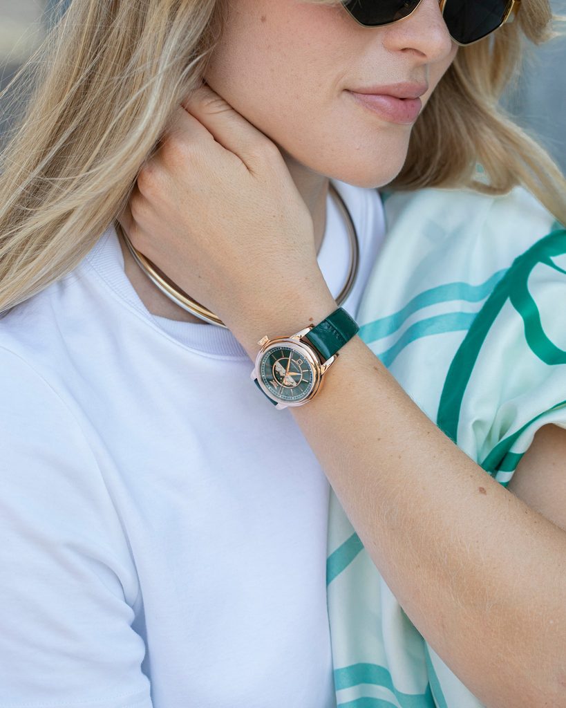Srdcom týchto hodiniek je spoľahlivý quartzový strojček Ronda 708 švajčiarskej výroby. Je vybavený komplikáciou fázy mesiaca, ktorá je zvýraznená prepracovanou povrchovou úpravou, metalizáciou a leštením. Táto komplikácia, pracujúca s absolútnou presnosťou deň po dni, vám umožňuje byť v presnom súlade s mnohými fázami mesiaca počas celého mesiaca.