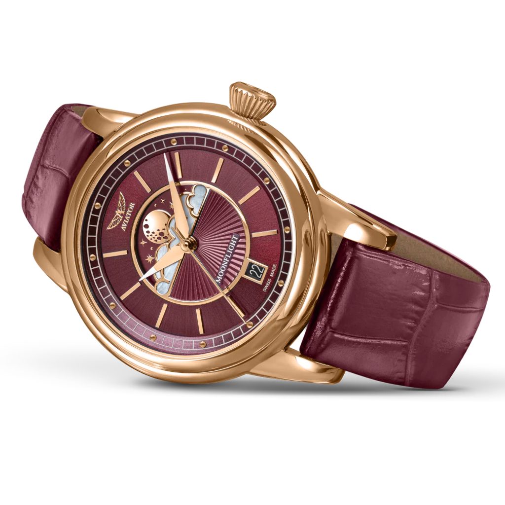 Zlatý vek letectva priniesol do cestovania novú úroveň sofistikovanosti. Módni návrhári vniesli extravaganciu a umenie do dizajnu oceľových uniforiem lietadiel a palubného personálu. Nočné lety na palube lietadla Douglas DC-3 ponúkali luxusné vybavenie a veľkolepú mystiku mesiaca za oknami - od západu do východu slnka. Inšpirovaný touto érou luxusu a tajomným pôvabom mesiaca prináša Aviator MoonFlight eleganciu na dosah ruky. Farebná paleta, lesklé hladké povrchy a slnečné giloše sú skutočne veľmi podobné 30. rokom minulého storočia. Obláčiky z čistej perlete evokujú krásnu jednoduchosť s nádychom flapper módy, zatiaľ čo fascinujúci disk s fázami mesiaca zachytáva nočnú oblohu tak, ako žiarila pred mnohými mesiacmi a bude svietiť aj naďalej.
