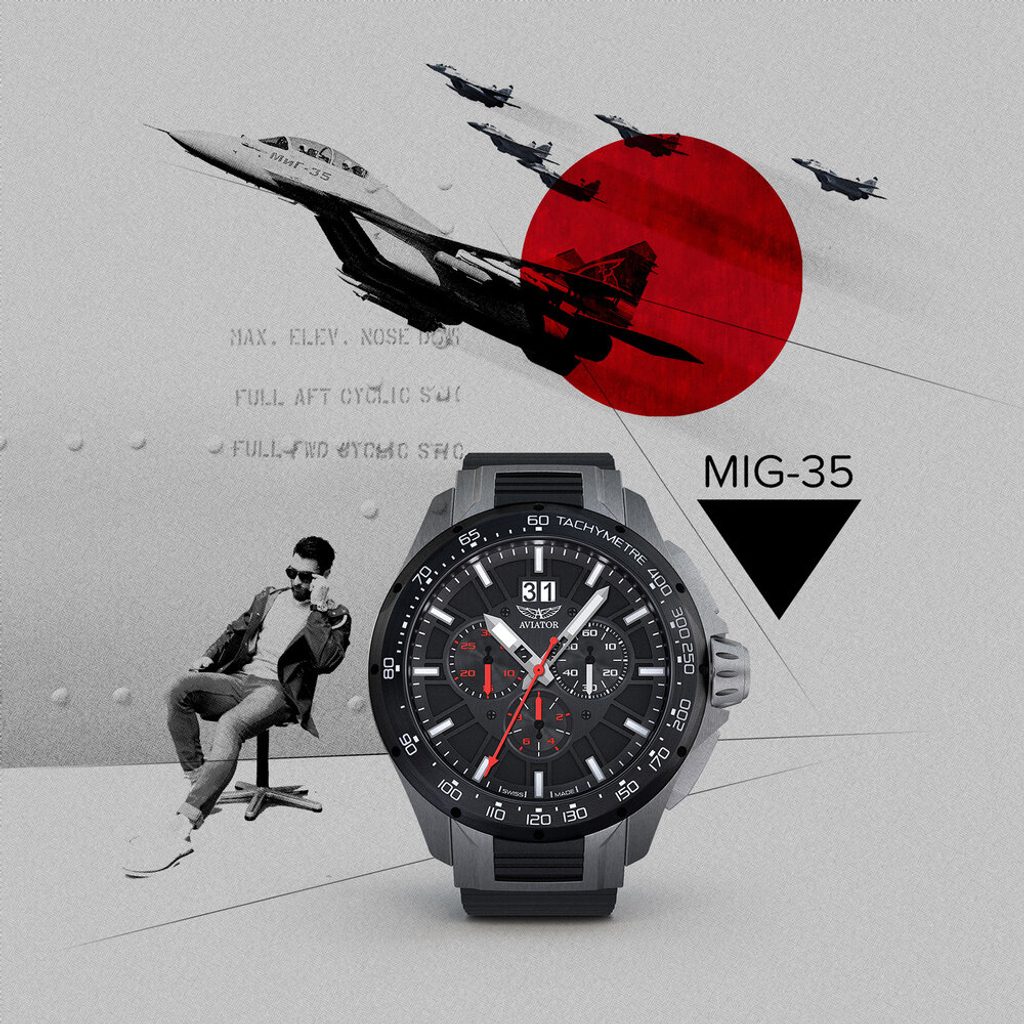 Hodinky MiG-35 Chrono sú poctou najnovšej generácii stíhacích lietadiel. Viaceré kľúčové estetické detaily sú priamo inšpirované touto stíhačkou: jemne brúsený stred puzdra a tlačidlá evokujú aerodynamické krivky trupu, zatiaľ čo korunka pripomína tvar prúdového motora; rebrovaný gumový pásik je priamym odkazom na kyslíkovú trubicu používanú pri výškových letoch.