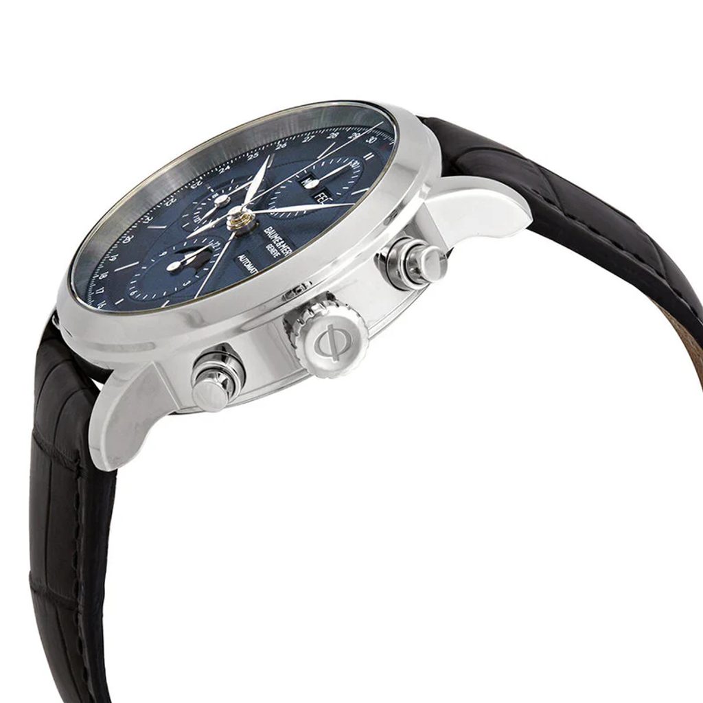 Hodinky Baume & Mercier Classima M0A10484 v sebe spájajú precíznosť, remeselné spracovanie a eleganciu. Má prehľadný modrý ciferník s gilošovaným zdobením, tromi subciferníkmi a striebornými reliéfnymi indexmi na pozíciách hodín. Celok vhodne dopĺňajú elegantné strieborné listové ručičky. Na prvý pohľad zaujmú kalendárne funkcie hodiniek s centrálnou dátumovkou a dátumovými značkami okolo ciferníka, zobrazenie dňa a mesiaca na diskoch na 12. hodine, ukazovateľ fázy mesiaca v subciferníku na 6. hodine a v neposlednom rade funkcia stopiek s počítadlami na 6. a 12. hodine. Na subciferníku na 9. hodine sa nachádza sekundová ručička hodiniek a 24-hodinový ukazovateľ času.
