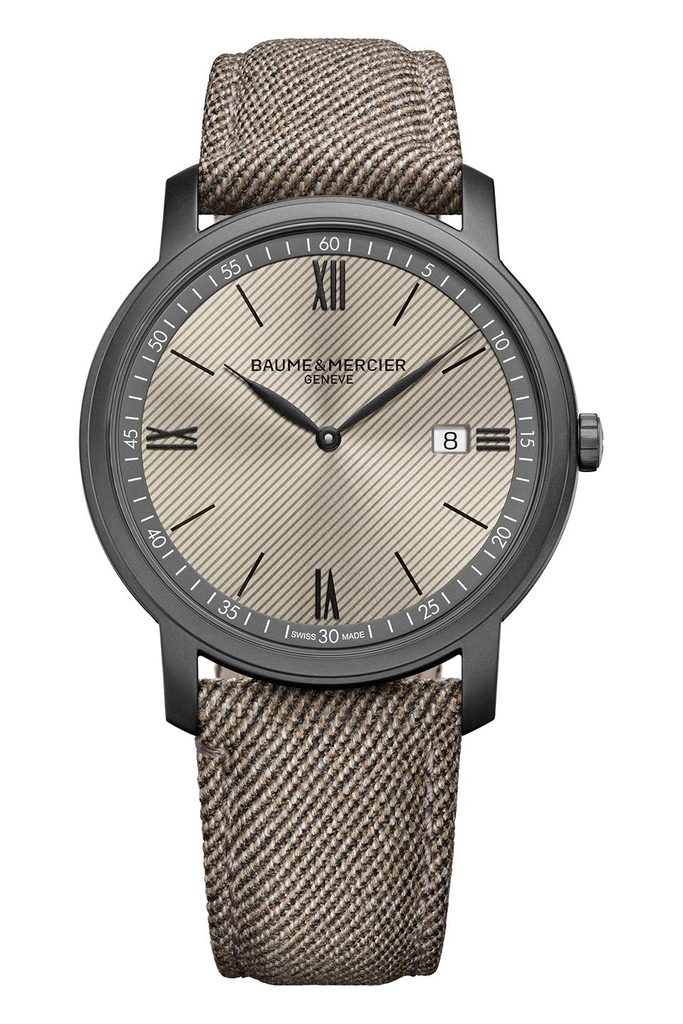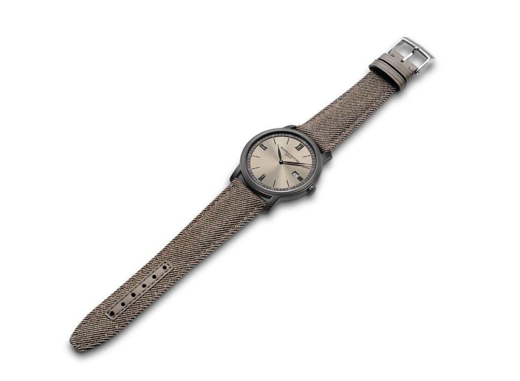 Hodinky Baume & Mercier Classima M0A10767 majú jednoduchý pieskový ciferník s jemným líniovým zdobením a bridlicovo šedým minútovým prstencom, ktorý dopĺňajú čierne aplikované indexy striedajúce sa s rímskymi číslicami na pozíciách hodín. Celok vhodne dopĺňajú elegantné listové ručičky.