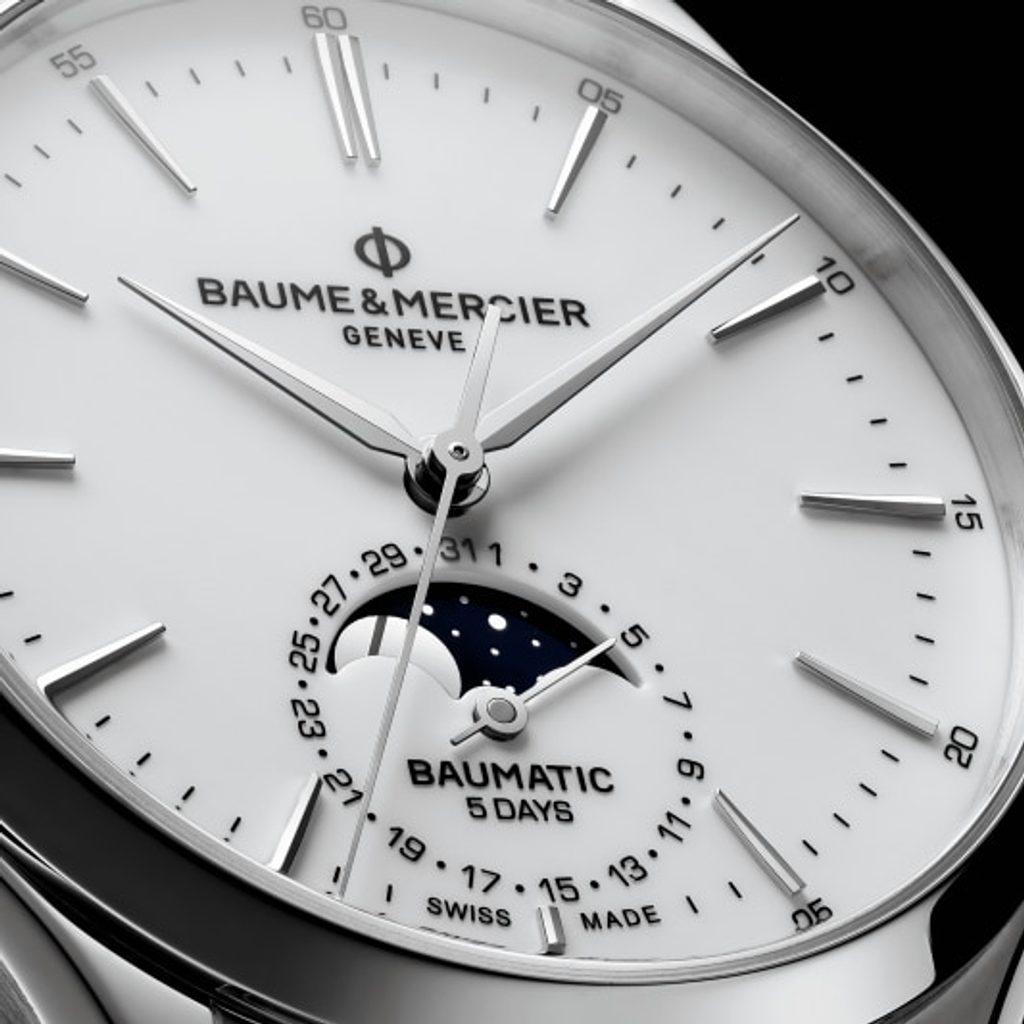 Hodinky Baume & Mercier Clifton M0A10549 majú biely lakovaný ciferník pripomínajúci porcelán. Kontrastné strieborné alfa ručičky a reliéfne indexy na pozíciách hodín zabezpečujú prehľadnosť. Hodinky poháňa vlastný mechanický strojček Baumatic BM14-1975AC1 s pôsobivou rezervou chodu 120 hodín. Samonáťahový strojček s frekvenciou 28 800 polofrekvencií za hodinu ponúka možnosť naťahovania korunkou, funkciu stopiek pri nastavovaní času (hacking) zobrazenie dátumu a fázy mesiaca na subciferníku na pozícii 6 hodín. Fáza mesiaca sa ovláda korekčným tlačidlom ukrytým v bočnej časti puzdra. Strojček poteší presnosťou len -4 až +6 s/d.