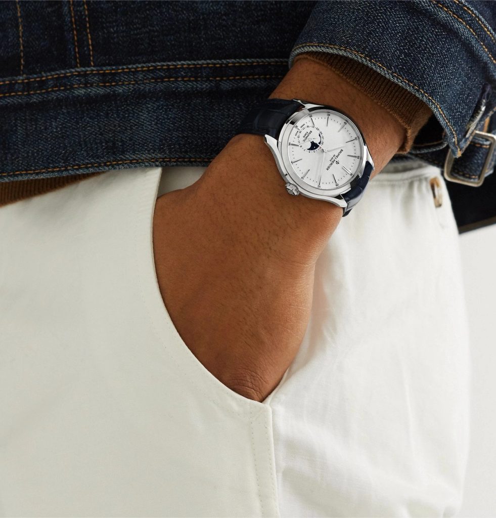 Oceľové puzdro hodiniek dopĺňa elegantný modrý remienok z aligátora, zakončený motýľovou sponou. Pekným detailom je mierne tvarovaná koncovka, vďaka ktorej remienok siaha až k puzdru. Remienok je vybavený rýchloupínacím systémom, vďaka ktorému je jeho výmena veľmi jednoduchá bez použitia náradia.