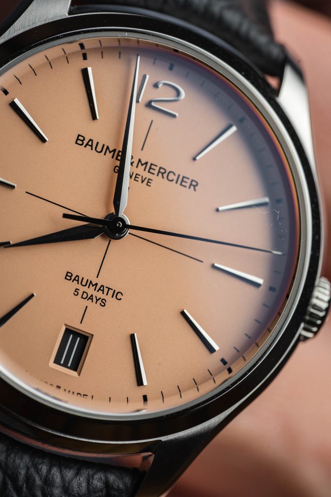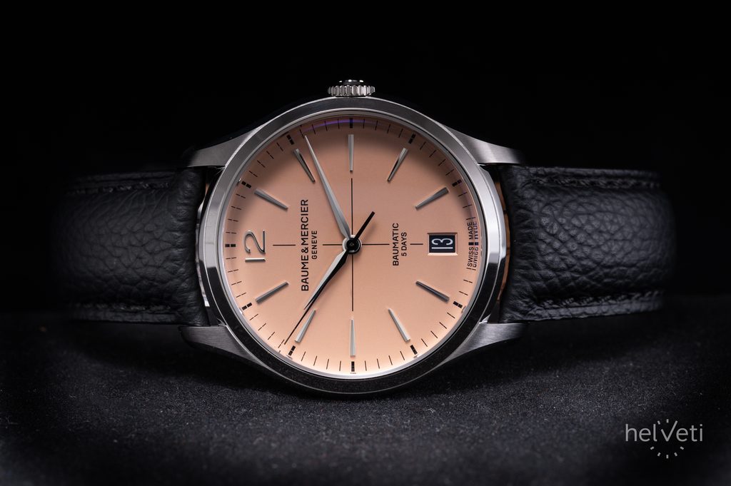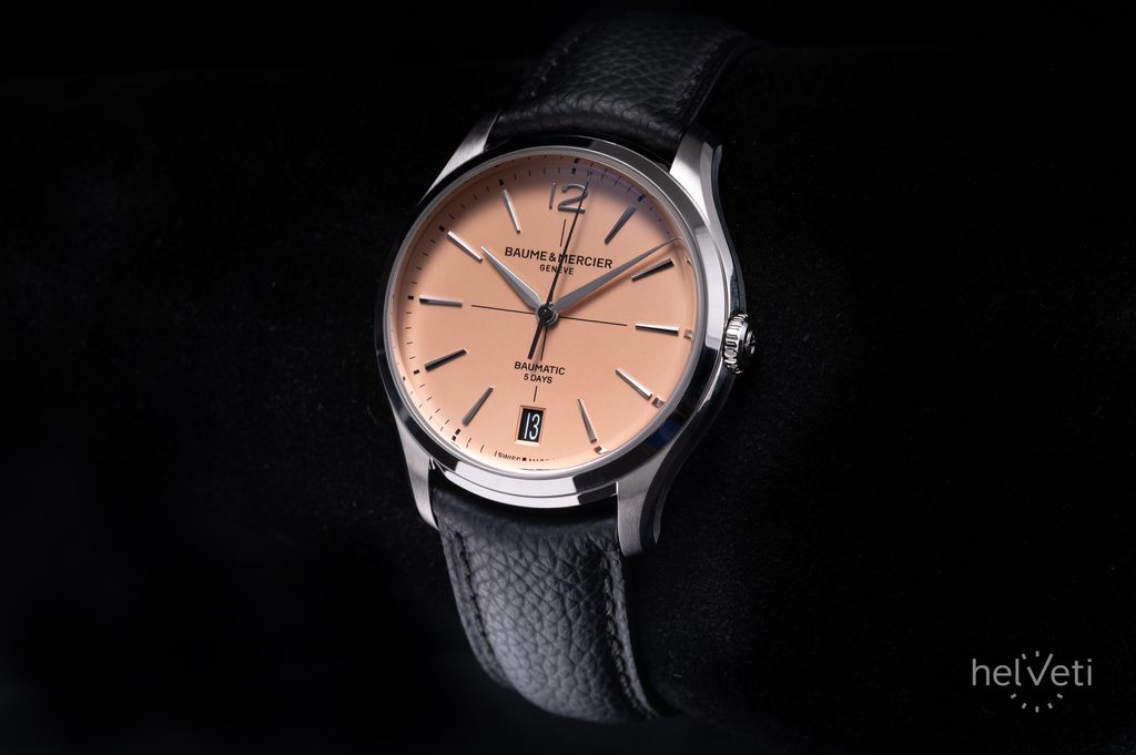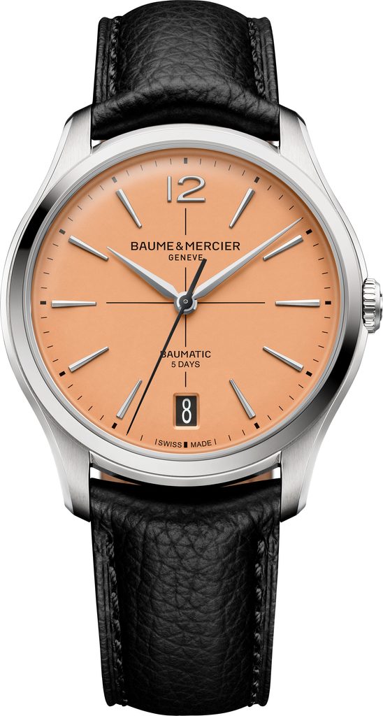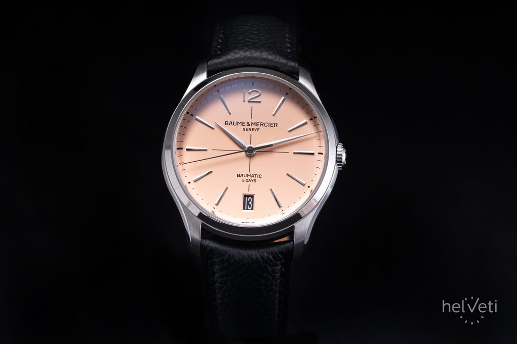 Hodinky Baume & Mercier Clifton M0A10778 majú ciferník lososovej farby s kontrastnou čiernou sekundovou ručičkou a minútovou stupnicou vytlačenou po obvode. O prehľadnosť sa starajú ródiované alfa ručičky a aplikované ihličkové indexy na pozíciách hodín, doplnené arabskými číslicami na 12. hodine. Hodinky poháňa mechanický strojček Baumatic BM13-1975A vlastnej výroby s pôsobivou rezervou chodu 120 hodín. Samonáťahový strojček s frekvenciou 28 800 polofrekvencií za hodinu ponúka možnosť naťahovania korunkou, funkciu zastavenia sekúnd pri nastavovaní času(hacking) a praktickú funkciu dátumu na pozícii 6 hodín. Strojček poteší presnosťou porovnateľnou s chronometrami.