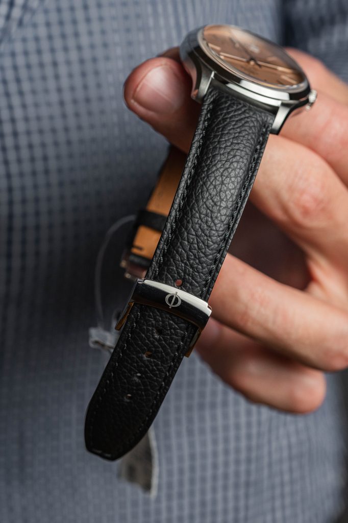 Oceľové puzdro hodiniek dopĺňa elegantný čierny remienok z teľacej kože, ktorý možno ľubovoľne vymeniť za moka kožený remienok, ktorý je súčasťou balenia. Remienky sú zakončené motýľovou sponou. Pekným detailom je mierne tvarovaná koncovka, vďaka ktorej remienky priliehajú k puzdru. Remienky sú vybavené rýchloupínacím systémom, vďaka ktorému je prípadná výmena veľmi jednoduchá aj bez použitia náradia.