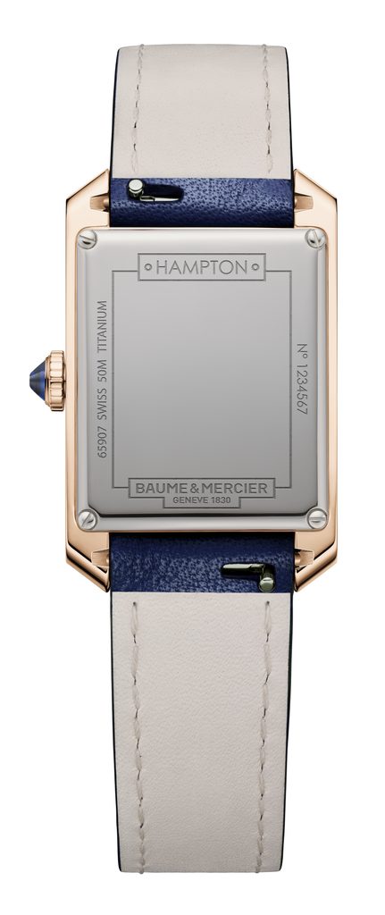 Ciferník hodiniek, ktorého jemný lesk je dosiahnutý lakovaním, chráni zafírové sklíčko s vysokou odolnosťou proti poškriabaniu. Eleganciu týchto hodiniek umocňuje obdĺžnikový tvar puzdra, detailné spracovanie a syntetický modrý spinel vsadený do korunky, ktorý z hodiniek robí klenot. Puzdro z 18-karátového ružového zlata s titánovým ciferníkom dopĺňa tmavomodrý remienok z teľacej kože zakončený tŕňovou sponou. Kožený remienok je vybavený aj rýchloupínacím systémom, vďaka ktorému je jeho výmena veľmi jednoduchá bez použitia náradia. Vodotesnosť tohto modelu je 50 m. Rozmery puzdra sú ideálne 34,9 mm na výšku a 22 mm na šírku pre dámske zápästie.