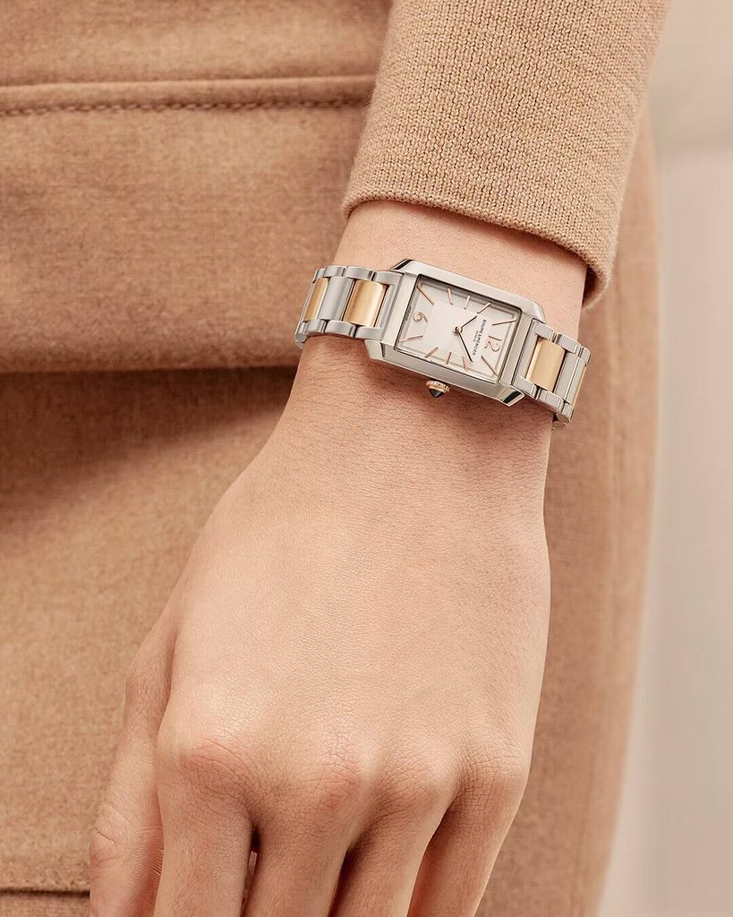 Ciferník hodiniek pozostávajúci z hladkého stredu a štruktúrovaného obvodu je chránený zafírovým sklíčkom s vysokou odolnosťou proti poškriabaniu. Eleganciu týchto hodiniek umocňuje obdĺžnikový tvar puzdra, detailné spracovanie a syntetický čierny spinel vsadený do korunky, ktorý z hodiniek robí klenot. Oceľové puzdro dopĺňa trojradový oceľový náramok ukončený motýľovým zapínaním. Náramok má dvojfarebnú povrchovú úpravu a články z ružového zlata sú pozlátené. Náramok je navyše vybavený systémom rýchleho uvoľnenia, vďaka ktorému je v prípade potreby veľmi jednoduché vymeniť náramok za remienok, a to aj bez použitia náradia. Vodotesnosť tohto modelu je 50 m. Rozmery puzdra sú ideálne pre dámske zápästie, na výšku má 34,9 mm a na šírku 22 mm.