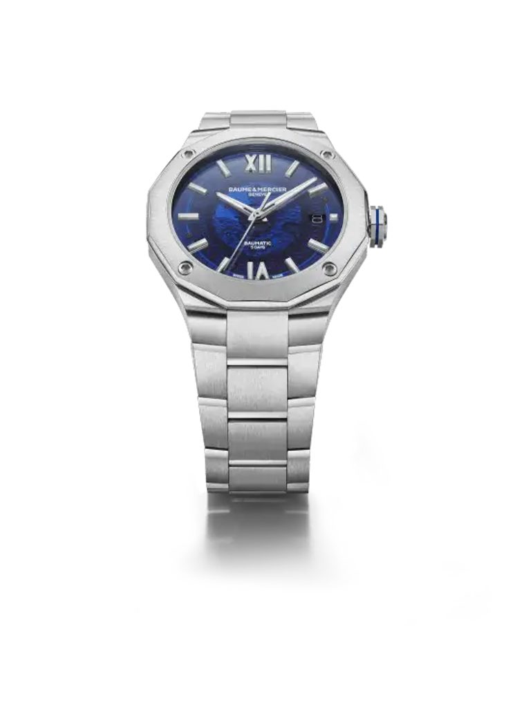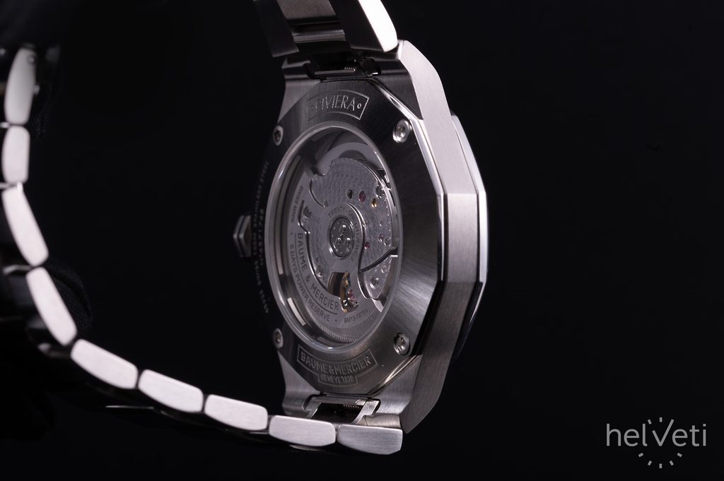 Hodinky Baume & Mercier Riviera M0A10616 majú zafírovo modrý priehľadný ciferník, ktorý odhaľuje pohľad do vnútra hodiniek. Kontrastné strieborné ručičky a reliéfne indexy na pozíciách hodín zaručujú prehľadnosť. Hodinky poháňa mechanický strojček Baumatic BM13-1975A vlastnej výroby s pôsobivou rezervou chodu 120 hodín. Samonáťahový strojček s frekvenciou 28 800 polofrekvencií za hodinu ponúka možnosť navíjania korunkou, funkciu stop-sekúnd pri nastavovaní času (hacking) a dátum na pozícii 3 hodín.