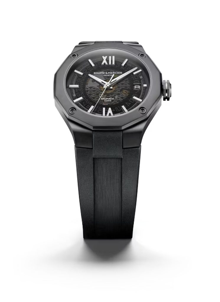 Hodinky Baume & Mercier Riviera M0A10617 majú zafírovo priehľadný ciferník čiernej farby, ktorý odhaľuje pohľad do vnútra hodiniek. Kontrastné strieborné ručičky a reliéfne indexy na pozíciách hodín zabezpečujú prehľadnosť. Hodinky poháňa mechanický strojček Baumatic BM13-1975A vlastnej výroby s pôsobivou rezervou chodu 120 hodín. Samonáťahový strojček s frekvenciou 28 800 polofrekvencií za hodinu ponúka možnosť naťahovania korunkou, funkciu stopiek pri nastavovaní času (hacking) a dátum na pozícii 3 hodín.