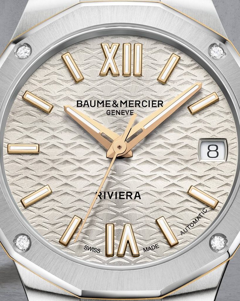 Hodinky Baume & Mercier Riviera M0A10730 majú ciferník vo farbe šampanského s typickou štruktúrou, doplnený ručičkami z ružového zlata a reliéfnymi indexmi na pozíciách hodín. Hodinky poháňa samonáťahový mechanický strojček Sellita SW200 s rezervou chodu približne 38 hodín. Strojček s frekvenciou 28 800 polofrekvencií za hodinu ponúka možnosť naťahovania korunkou, funkciu stop-sekúnd pri nastavovaní času (hacking) a dátum na pozícii 3 hodín.