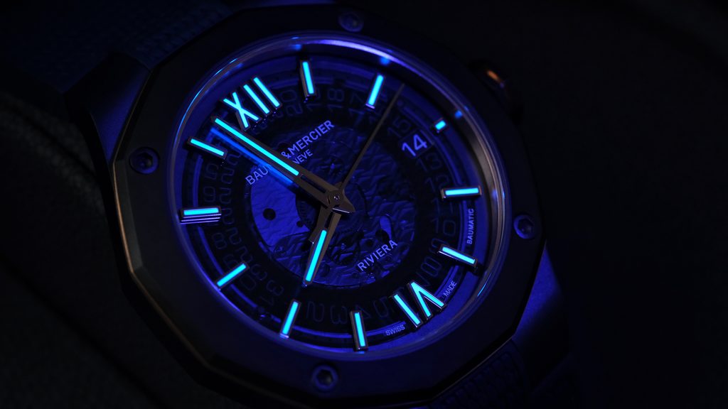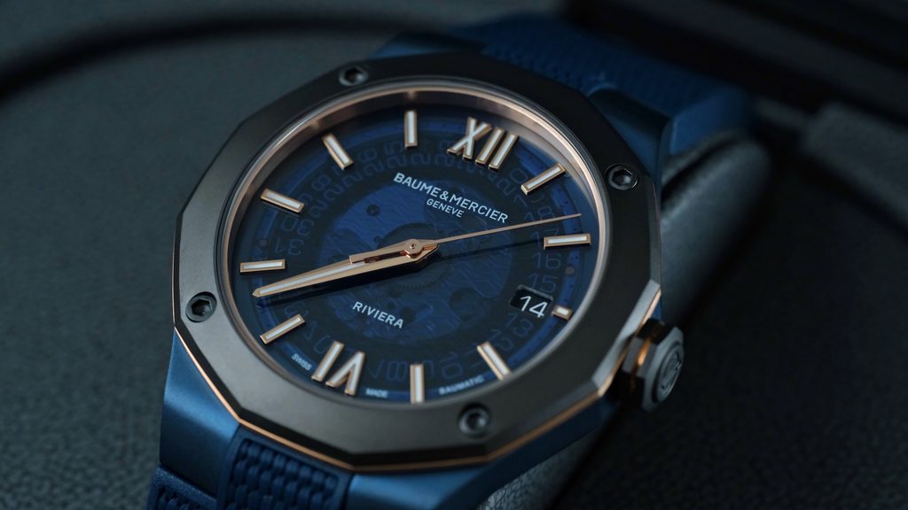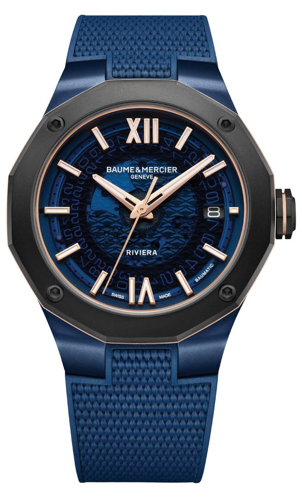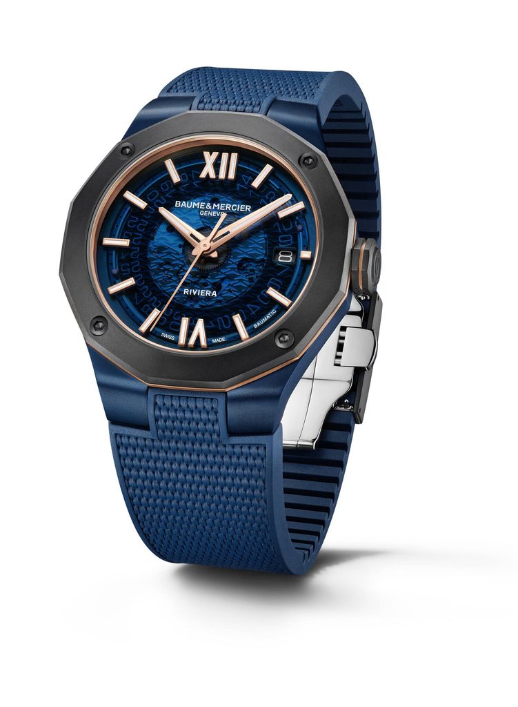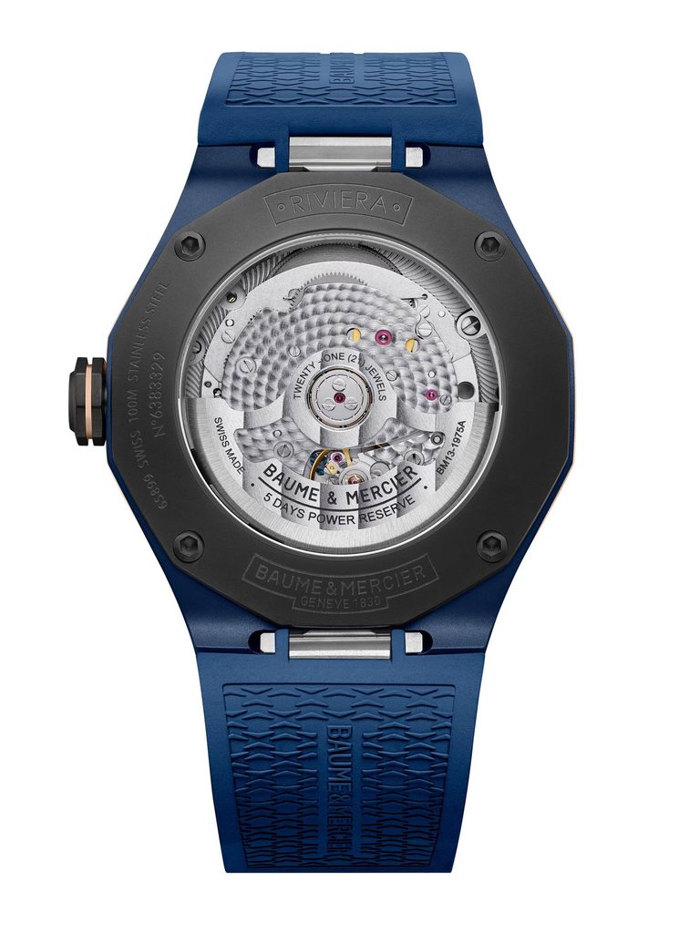 Hodinky Baume & Mercier Riviera M0A10769 majú zafírovo modrý priehľadný ciferník, ktorý odhaľuje pohľad do vnútra hodiniek. Kontrastné ručičky v ružovom zlate a reliéfne indexy na pozíciách hodín zaručujú prehľadnosť. Ružovo-zlatý prvok sa nachádza aj v podobe jemnej línie vinúcej sa stredom puzdra. Hodinky poháňa mechanický strojček Baumatic BM13-1975A vlastnej výroby s pôsobivou rezervou chodu 120 hodín. Samonáťahový strojček s frekvenciou 28 800 polofrekvencií za hodinu ponúka možnosť naťahovania korunkou, funkciu stopiek pri nastavovaní času (hacking) a dátum na pozícii 3 hodín.