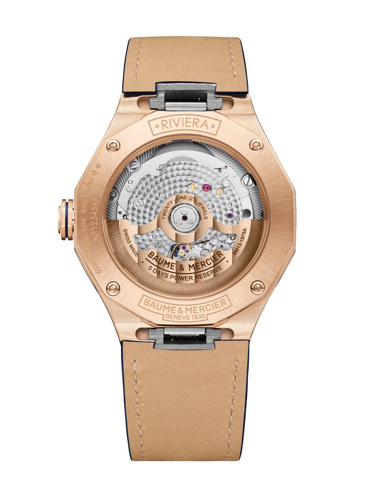 Hodinky Baume & Mercier Riviera M0A10815 majú zafírovo priehľadný ciferník v dymovo modrej farbe, ktorý odhaľuje pohľad do srdca hodiniek. O prehľadnosť sa starajú ručičky z ružového zlata a aplikované indexy na hodinových pozíciách. Hodinky poháňa mechanický strojček Baumatic BM13-1975A vlastnej výroby s pôsobivou rezervou chodu 120 hodín. Samonáťahový strojček s frekvenciou 28 800 polofrekvencií za hodinu ponúka možnosť naťahovania korunkou, funkciu stop-sekúnd pri nastavovaní času (hacking) a dátum na pozícii 3 hodín.