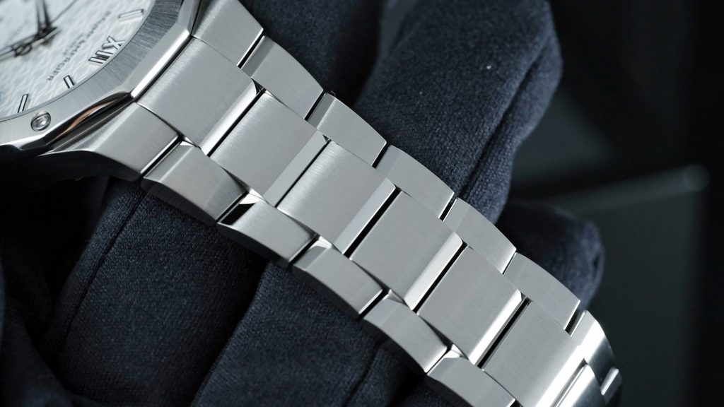 Oceľové puzdro hodiniek dopĺňa trojradový oceľový náramok ukončený motýľovou sponou. Práve 4 funkčné skrutky v lunete, saténový povrch a integrovaný náramok podporujú športový nádych hodiniek. Náramok je navyše vybavený rýchloupínacím systémom, vďaka ktorému sa veľmi ľahko mení bez použitia náradia.