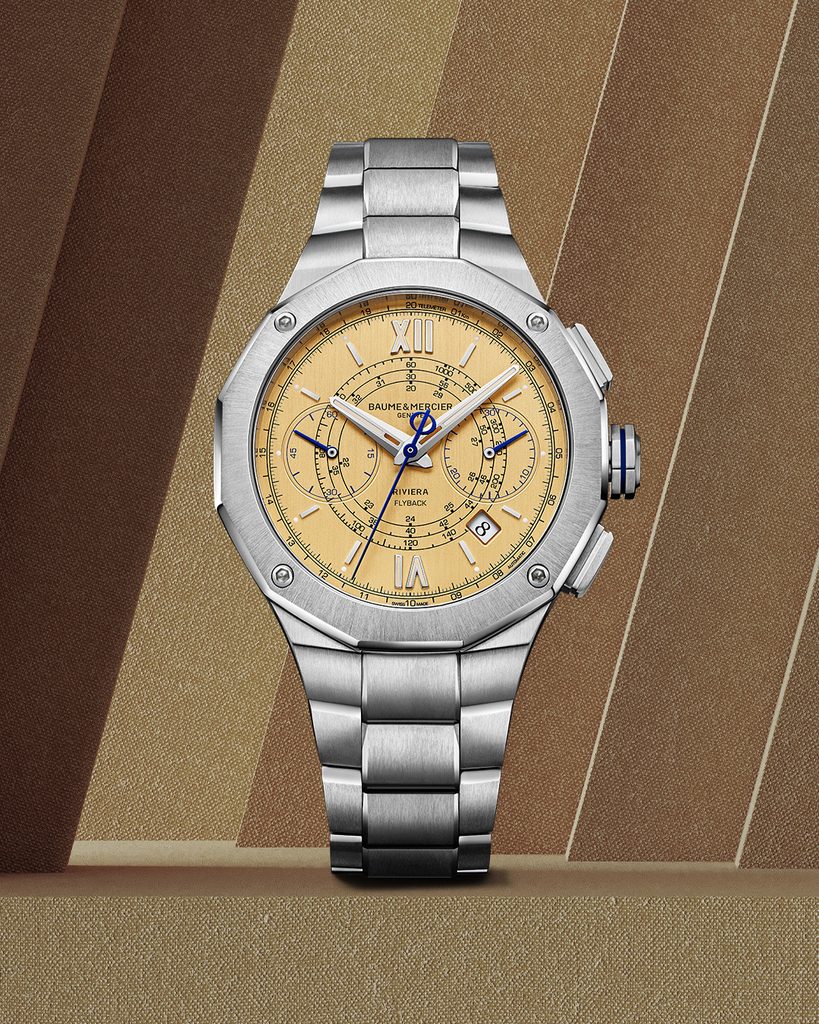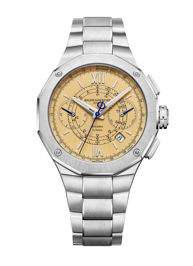 Baume & Mercier Riviera Flyback Chronograph 10828 sú limitovanou edíciou ikonického, športového a elegantného modelu z kolekcie Riviera, ktorá oslavuje rok 1973, rok uvedenia kolekcie na trh. Hodinky sa dodávajú v zmenšenej verzii, obohatenej o obľúbenú funkciu stopiek s rozloženými subciferníkmi vo verzii bicompax. Deisgn odráža pôvodný model, za ktorým nestojí nikto iný ako Gérald Genta.