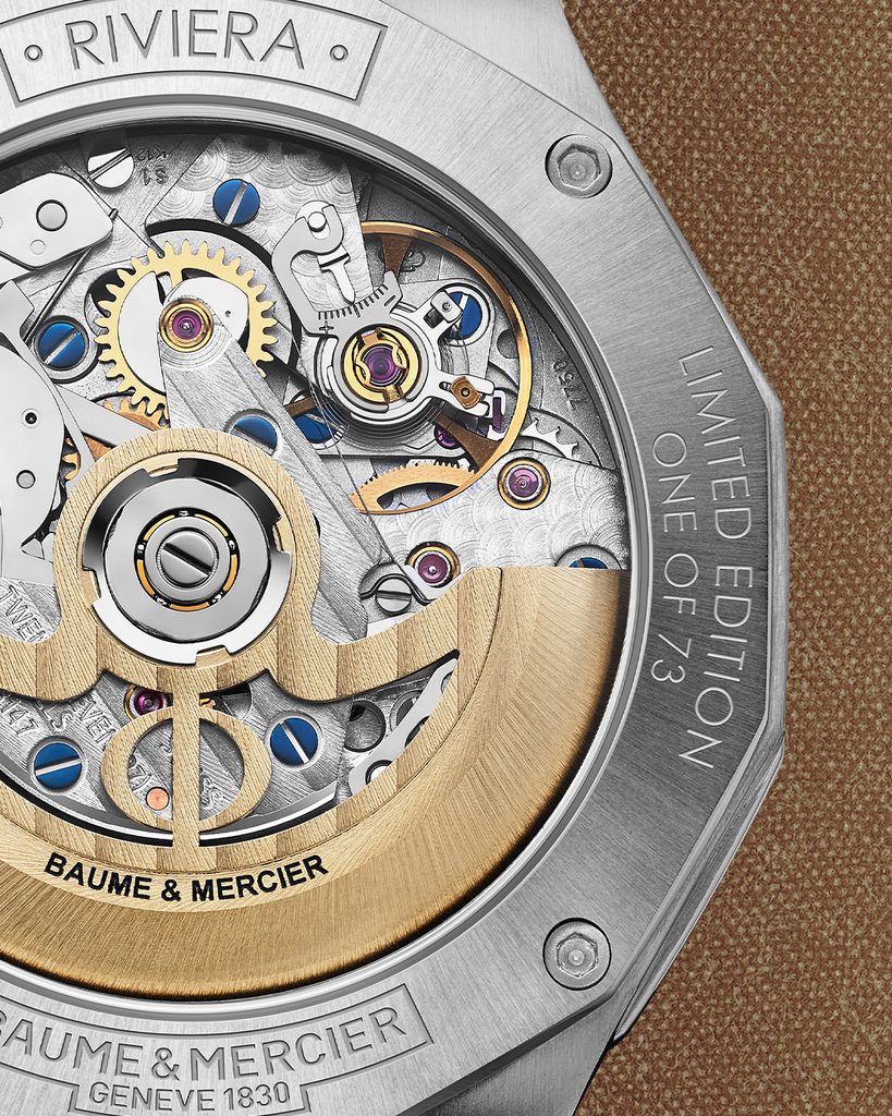 S hodinkami Baume & Mercier Riviera Flyback Chronograph 10828 sa do radu Riviera po mnohých rokoch vracia strojček s funkciou flyback chronografu. Ide o stopky, ktoré umožňujú spustiť nové meranie času iba stlačením tlačidla na pozícii 4 hodín, čím sa stopky zastavia, vynulujú a znovu spustia. Funkcia flyback bola zavedená v 30. rokoch 20. storočia, aby pomohla pilotom merať rôzne fázy letu. Na rozdiel od tradičného chronografu, ktorý vyžaduje tri samostatné úkony - zastavenie, resetovanie a opätovné spustenie - funkcia flyback umožňuje okamžitý návrat sekundovej ručičky na nulu a obnovenie merania času jediným stlačením spodného tlačidla.