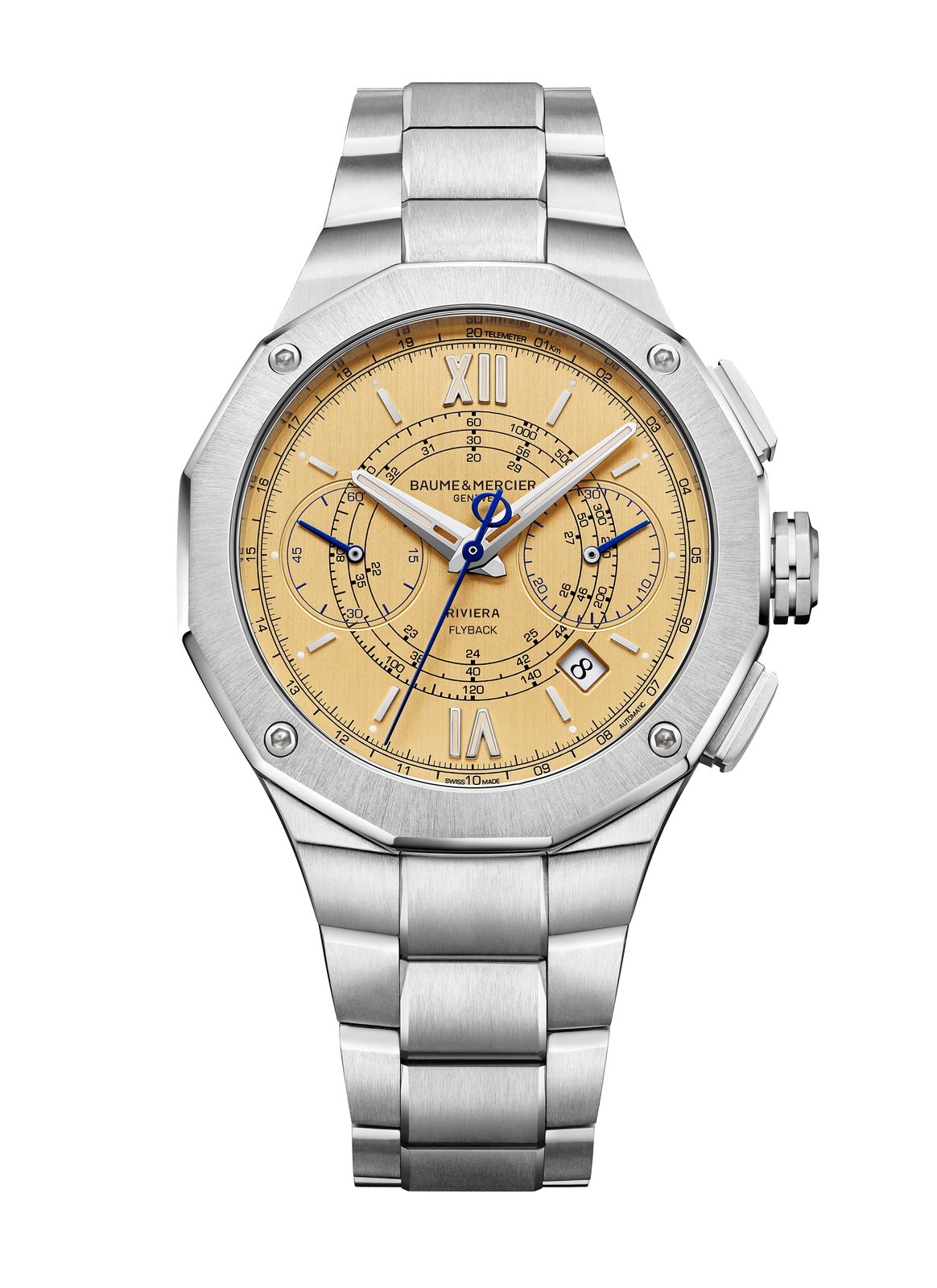 Hodinky Baume & Mercier Riviera M0A10828 majú pozlátený ciferník s vertikálnym rezom, doplnený o ródiované aplikované indexy a ručičky. Centrálna sekundová ručička a ručičky chronografu sú modré, čo vytvára príjemný kontrast. Zaujímavým detailom centrálnej sekundovej ručičky je symbol Fí umiestnený na jej konci.