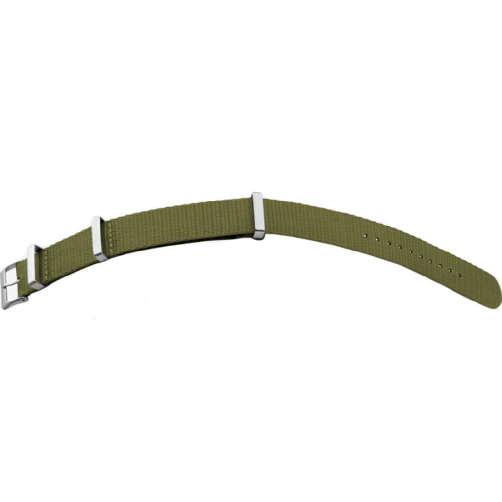 Nylonový remienok BEAR olivovej farby so šírkou 20 mm a striebornou sponou. Remienok je vyrobený z pevného dvojvrstvového nylonu. Otvory a boky remienka sú tepelne zapečatené pre vysokú odolnosť. Spona je vyrobená z brúsenej ocele.