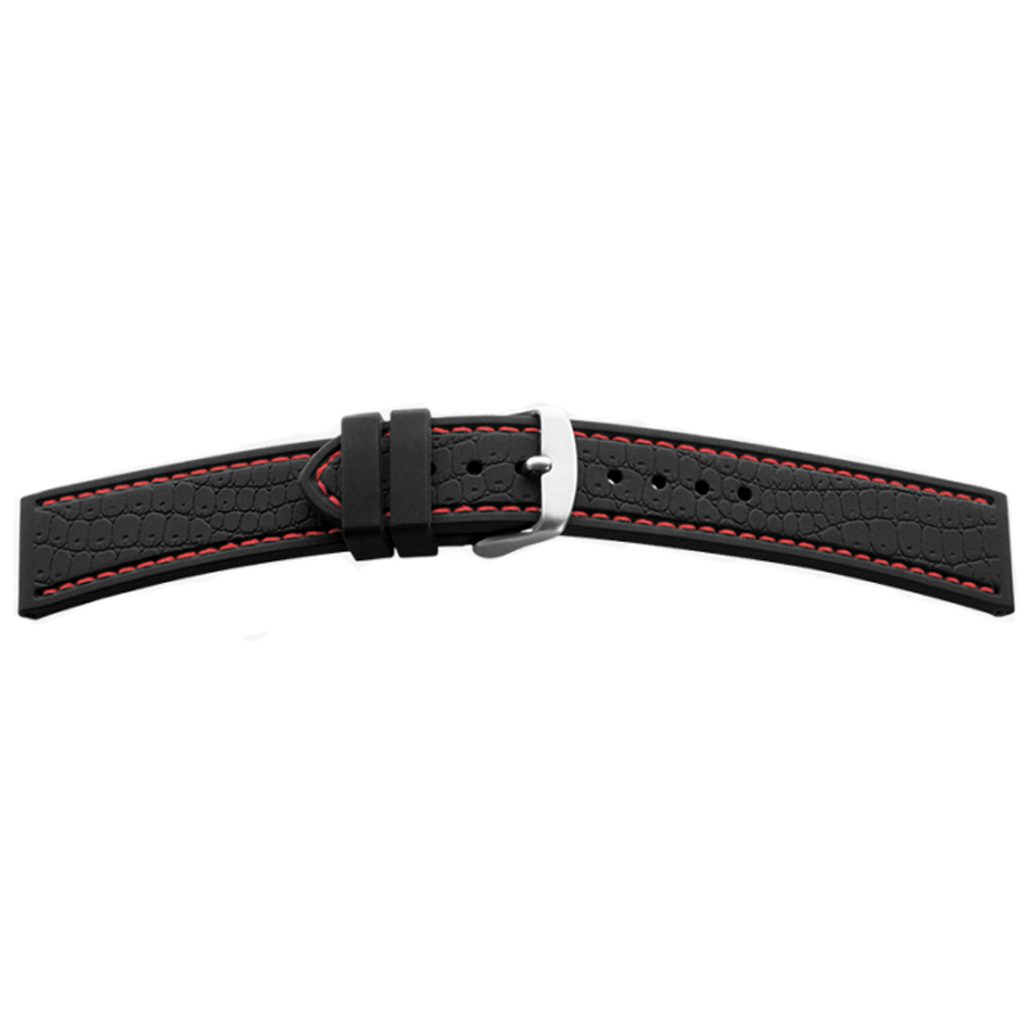 Silikónový remienok BEAR čiernej farby s "kroko" vzorom a s červeným prešitím, so striebornou sponou. Remienok je pri puzdre široký 20 mm a k spone sa zužuje na 18 mm.