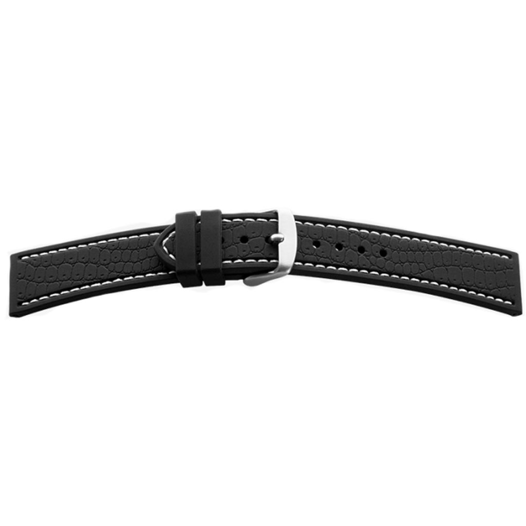 Silikónový remienok BEAR čiernej farby s "krokom" vzorom a s bielym prešitím, so striebornou sponou. Remienok je pri puzdre široký 22 mm a k spone sa zužuje na 20 mm.