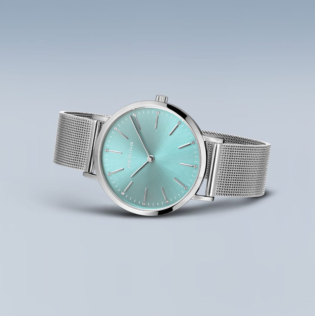 Puzdro hodiniek s priemerom 34 mm je vyrobené z vysokokvalitnej nehrdzavejúcej ocele, ktorá má lesklú povrchovú úpravu IP. Nekomplikovaný ľadovo modrý ciferník je dokonalým pozadím pre strieborné indexy a tenké ručičky, ktoré dokonale ladia so vzhľadom puzdra. Okrem nich sa na ciferníku nachádza aj 12 malých kryštálov.