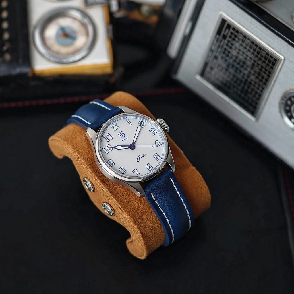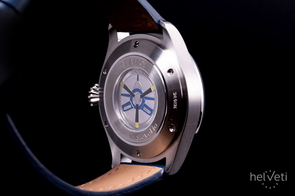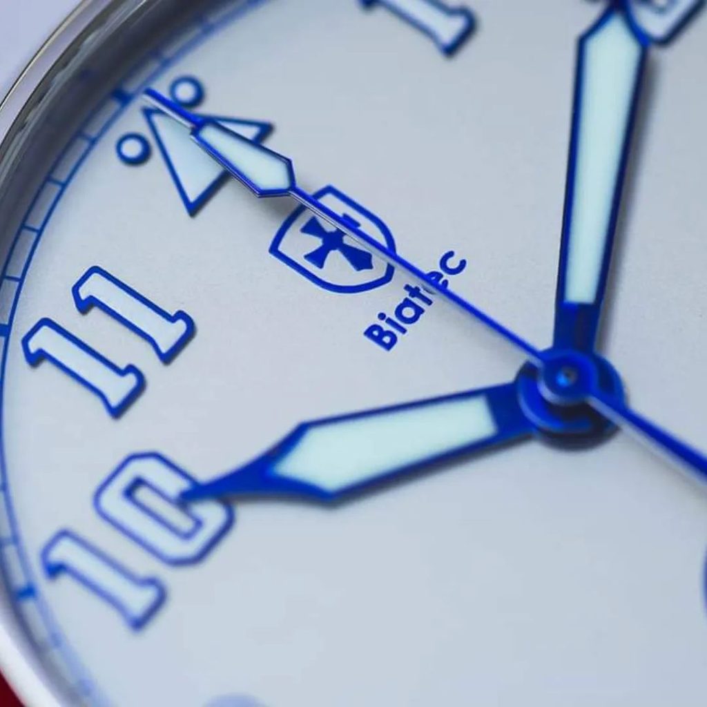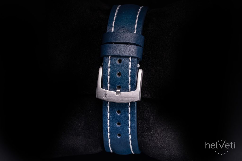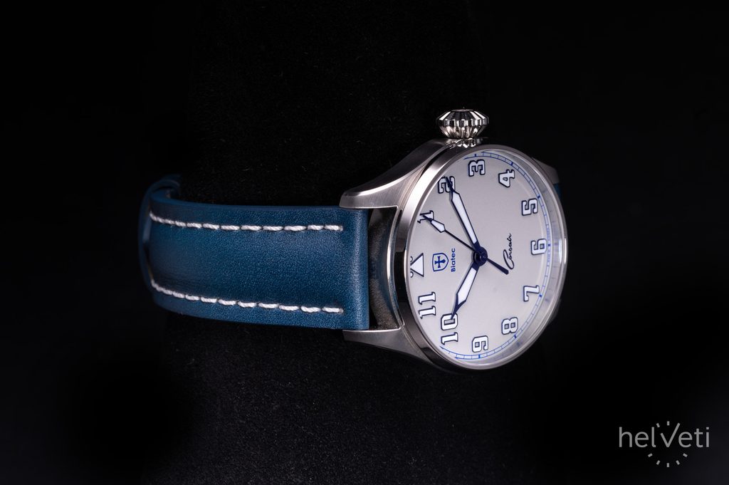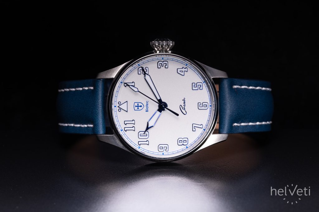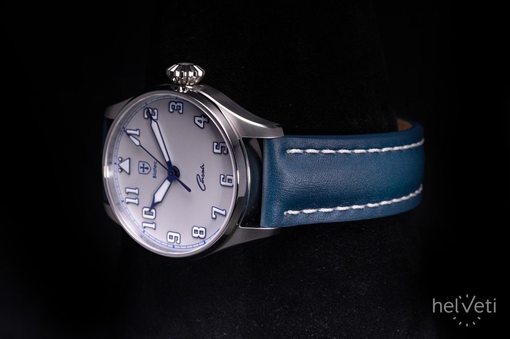 Dokonale prehľadný číselník striebornej farby, vyvedený v pilotnom štýle, je chránený zafírovým sklíčkom maximálne odolným voči poškriabaniu. Čitateľnosť za ostrého svetla potom zaisťuje obojstranná antireflexná vrstva. V tme a pri znížených svetelných podmienkach potom poslúži luminiscencia Luminova BGW9 na ručičkách a 3D indexoch. Hodinky na ruke drží kožený remienok modrej farby s bielym prešívaním. Vodeodolnosť týchto hodiniek je 100 m (10 ATM), zvládnu teda aj kontakt s vodou, ako je sprcha, dážď a plávanie.