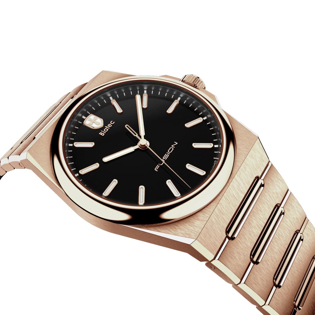 Model Biatec Fusion 02 sa môže pochváliť 39 mm puzdrom z nehrdzavejúcej ocele 316L s kombináciou leštenej a brúsenej povrchovej úpravy ružového zlata na puzdre a náramku. Vďaka technológii NanTec puzdro aj náramok modelu bez problémov odolávajú aj tomu najnáročnejšiemu zaobchádzaniu. Táto technológia zaručuje, že si hodinky zachovajú svoj lesk a krásu aj po rokoch nosenia.