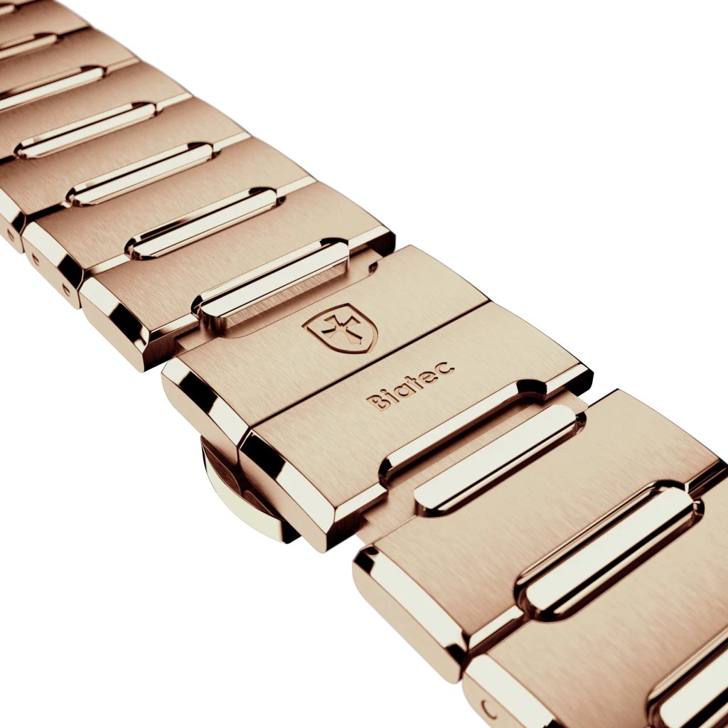 Náramok so šírkou 20 mm je vyrobený z nehrdzavejúcej ocele s povrchovou úpravou NanTec v ružovom zlate a je vybavený systémom rýchleho uvoľnenia a motýľovou sponou s mikroreguláciou, ktorá umožňuje pohodlné nastavenie celkovej dĺžky.