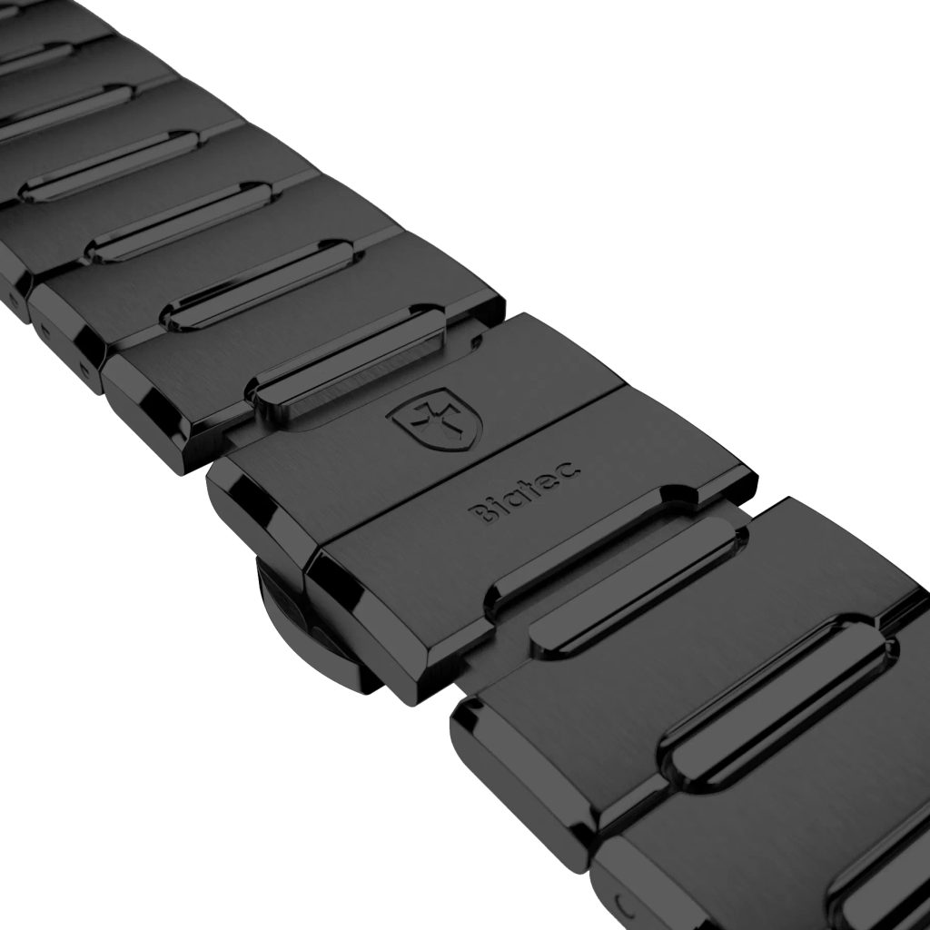 Náramok so šírkou 20 mm je vyrobený z nehrdzavejúcej ocele s povrchovou úpravou DLC v čiernej farbe a je vybavený rýchloupínacím systémom a motýľovou sponou s mikroreguláciou, ktorá umožňuje pohodlné nastavenie celkovej dĺžky.