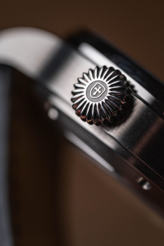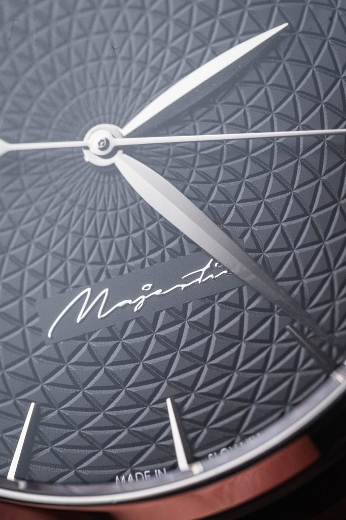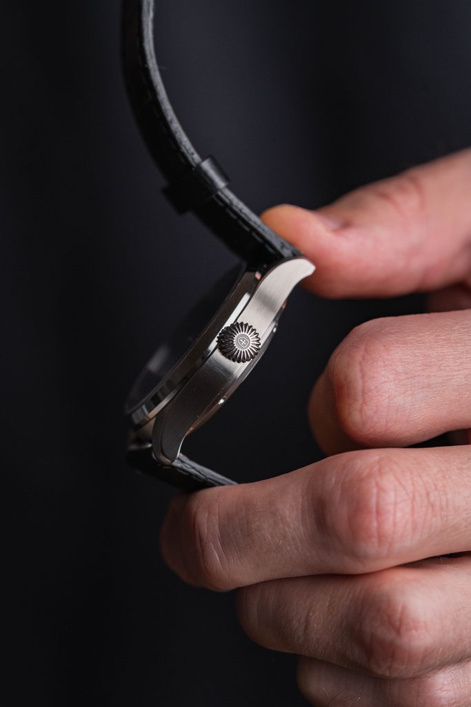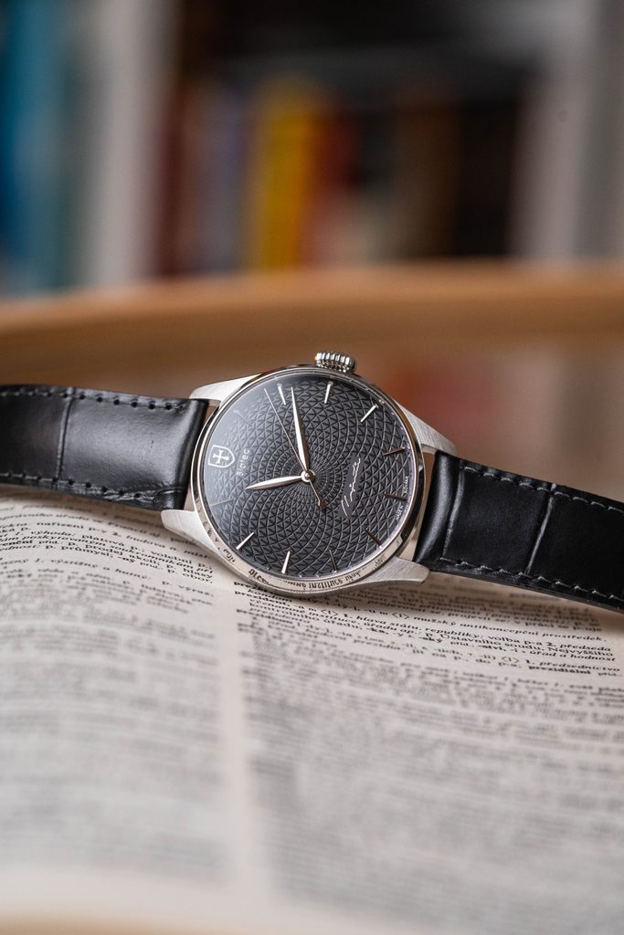 Čierny gilošovaný číselník s cirkulárnym 3D vzorom, na ktorom nájdeme leštené indexy a ručičky, je chránený zafírovým sklíčkom, ktoré je maximálne odolné voči poškriabaniu. Čitateľnosť za ostrého svetla potom zaisťuje obojstranná antireflexná vrstva. Vodeodolnosť týchto hodiniek je 100 m (10 ATM), zvládnu teda aj kontakt s vodou, ako je sprcha či dážď aj plávanie. Na ruke hodinky drží remienok z teľaciny s čiernym prešívaním.