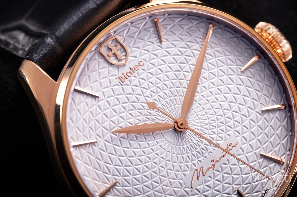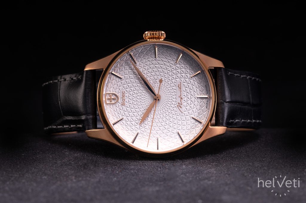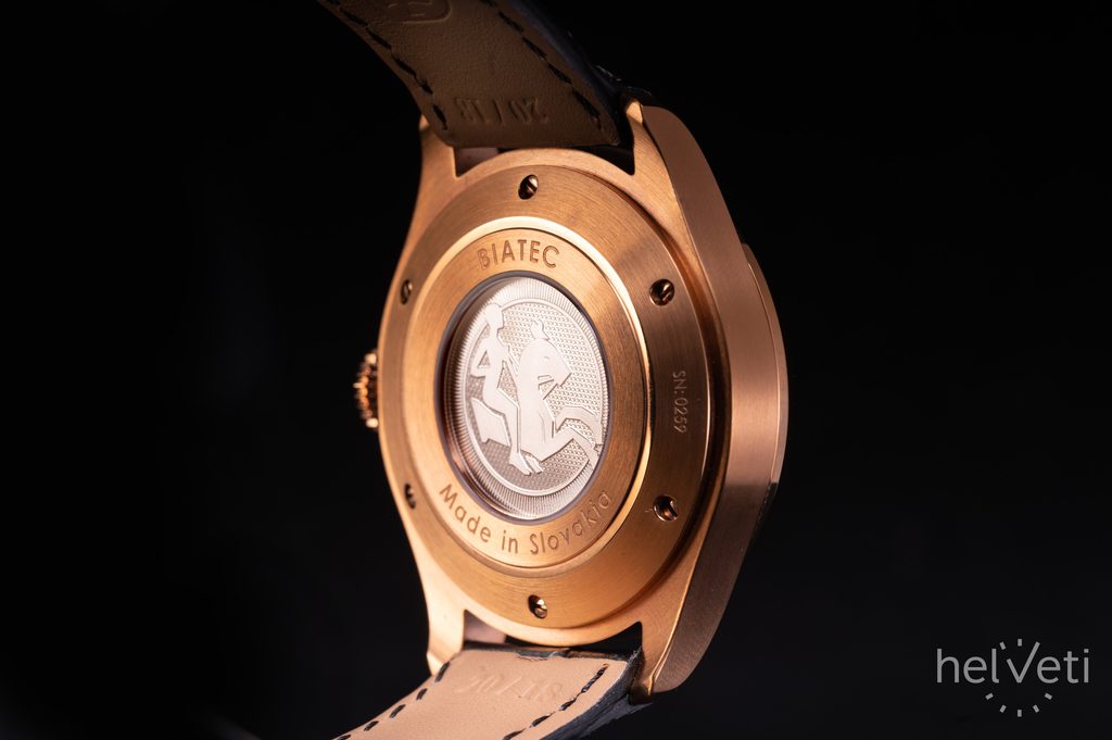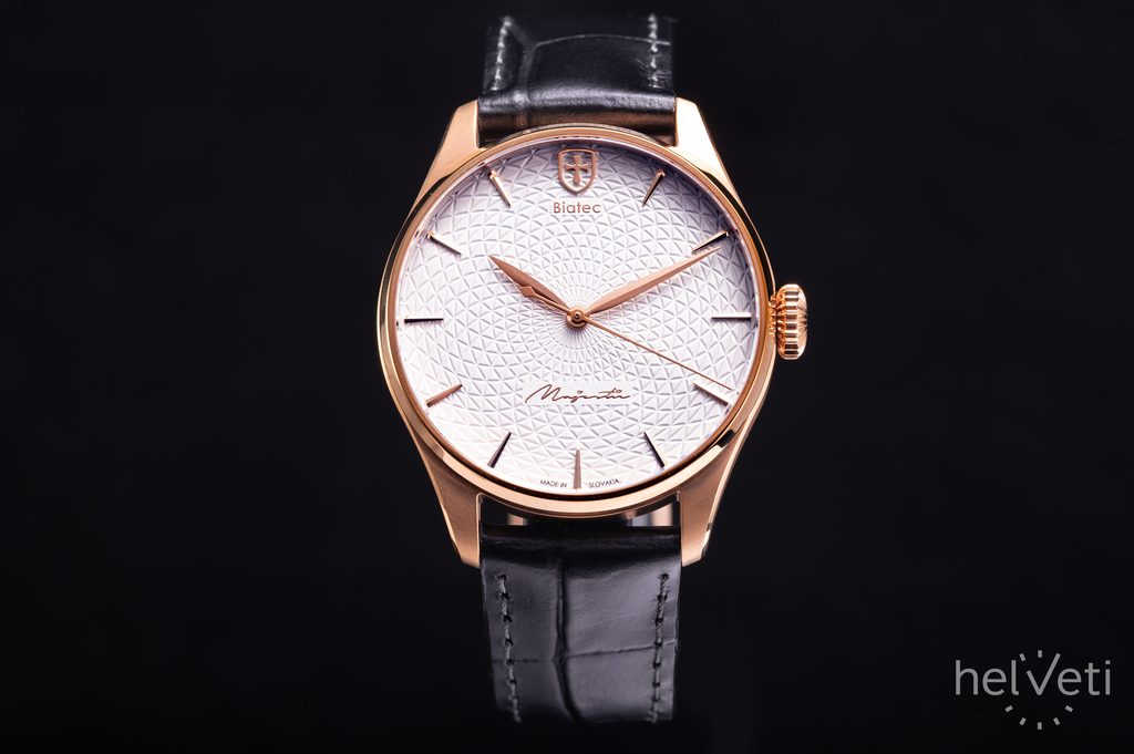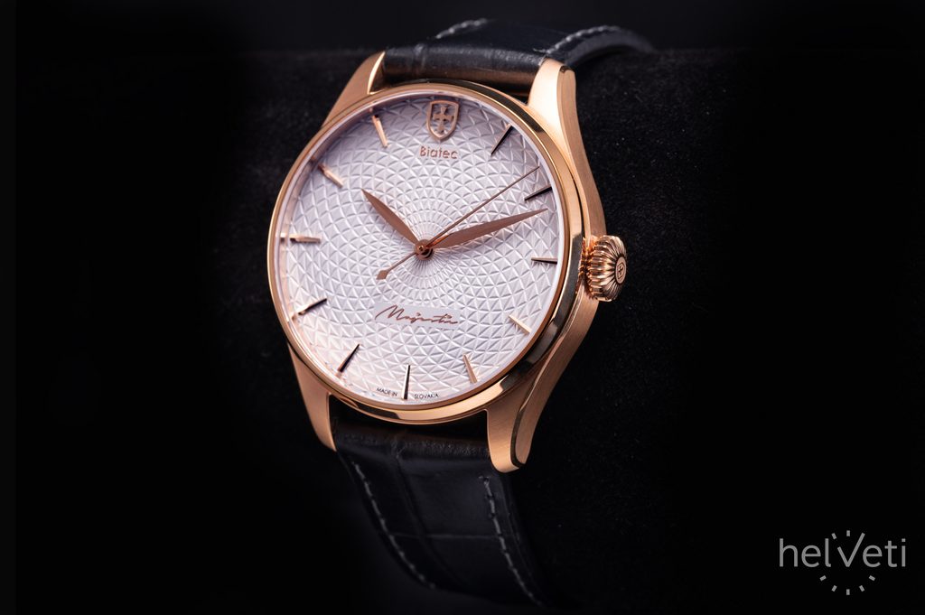 Hodinky Biatec Majestic 02 F sú poháňané švajčiarskym mechanickým strojčekom s automatickým náťahom Sellita SW200-1. Tento strojček s 26 kameňmi pracuje na frekvencii 28 800 polokmitov za hodinu (4Hz) a disponuje rezervou náťahu klasických 38 hodín. Puzdro hodiniek je vyrobené z ušľachtilej ocele v kombinácii leštených a brúsených plôch a v úprave PVD farby ružového zlata. Zaujímavosťou je potom prevedenie zadného viečka, kde cez priehľad zo zafírového sklíčka s antireflexnou vrstvou môžeme pozorovať striebornú mincu s motívom odvodeným od historických mincí "Biatec". Priemer puzdra je príjemných 40 mm, dĺžka (lug-to-lug) je 48 mm, hodinky tak dobre sadnú na väčšinu pánskych zápästí.