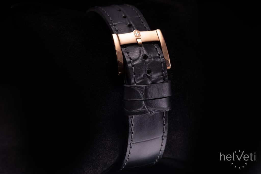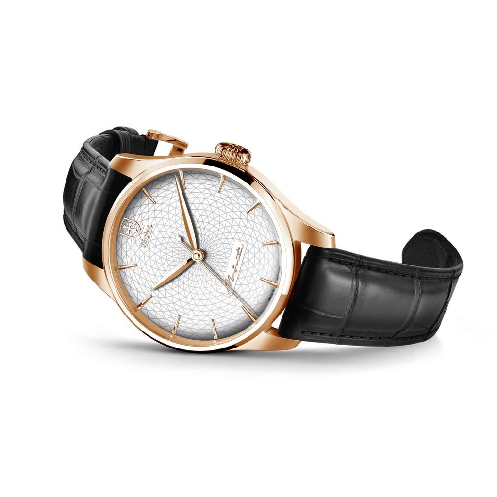 Biely gilošovaný číselník s cirkulárnym 3D vzorom, na ktorom nájdeme leštené indexy a ručičky, je chránený zafírovým sklíčkom, ktoré je maximálne odolné voči poškriabaniu. Čitateľnosť za ostrého svetla potom zaisťuje obojstranná antireflexná vrstva. Vodeodolnosť týchto hodiniek je 100 m (10 ATM), zvládnu teda aj kontakt s vodou, ako je sprcha či dážď aj plávanie. Na ruke hodinky drží remienok z teľaciny s čiernym prešívaním.
