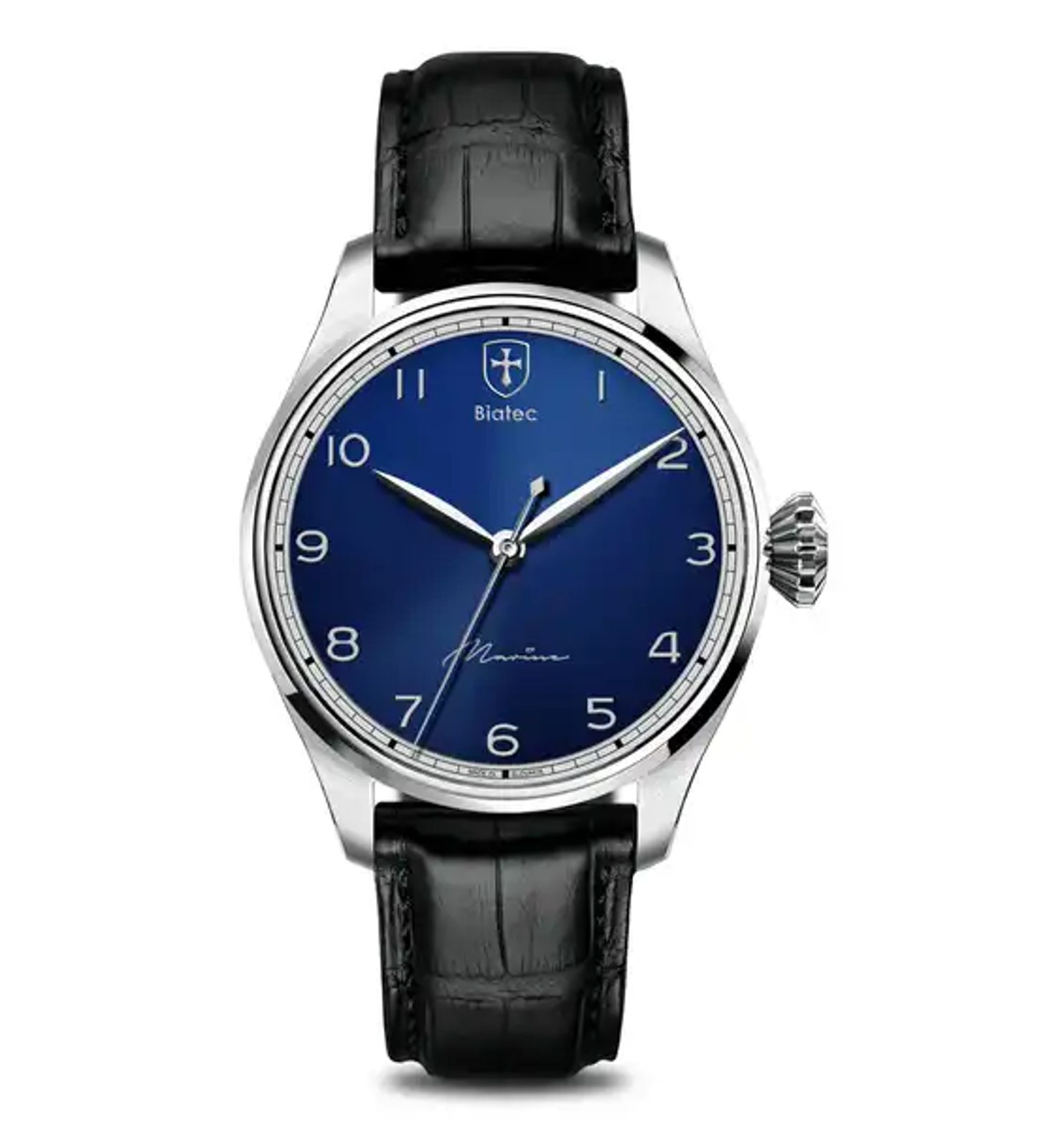 Kolekcia hodiniek radu Marine sa vyznačuje klasickým dizajnom s prehľadným ciferníkom a netradičnou korunkou v tvare diamantu, charakteristickou pre pilotné hodinky.