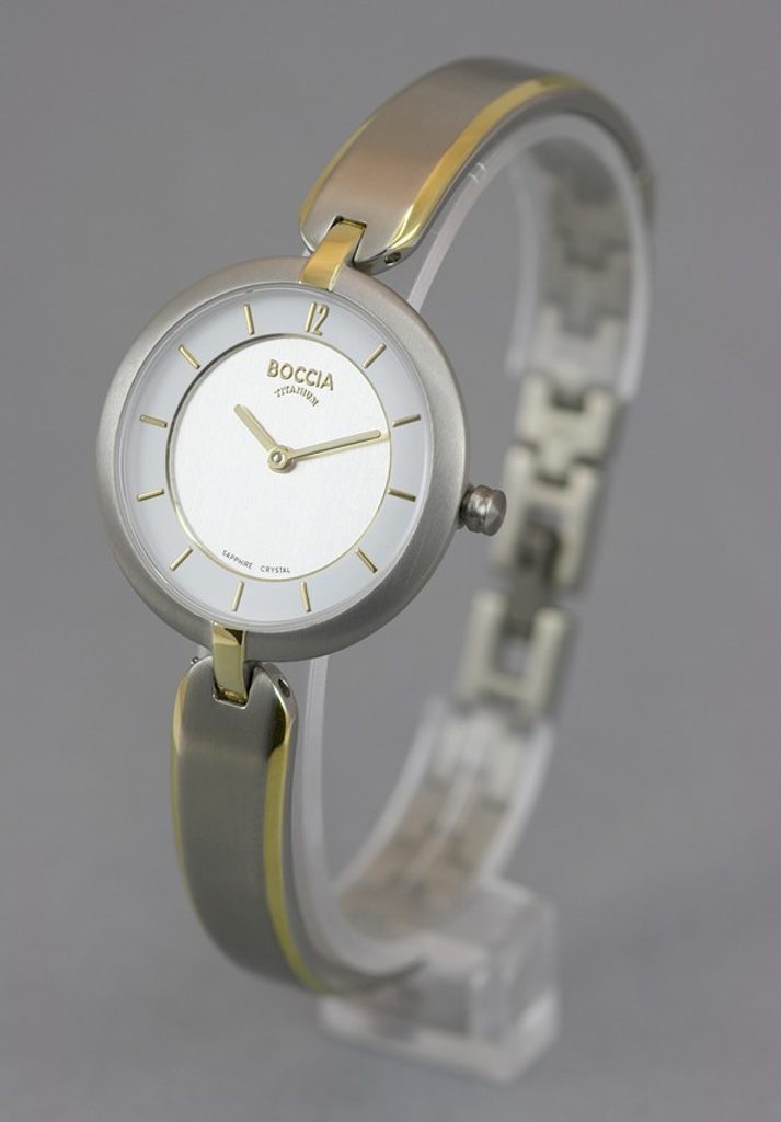 Dámske hodinky Boccia Titanium 3164-03 majú úzky titánový strojček, ktorý je zdobený zlatom a k hodinkám je pripevnený neobvyklým spôsobom. Ciferník okrúhleho tvaru je chránený zafírovým sklíčkom.