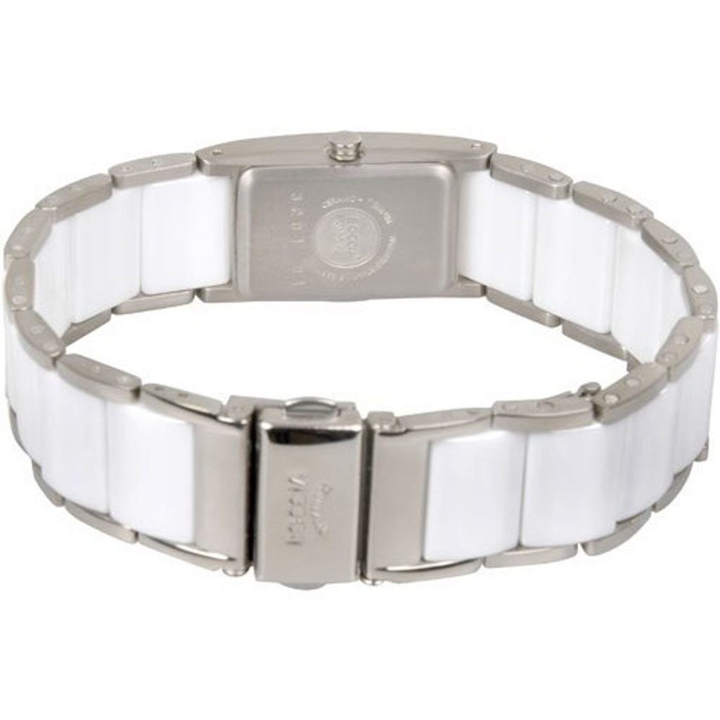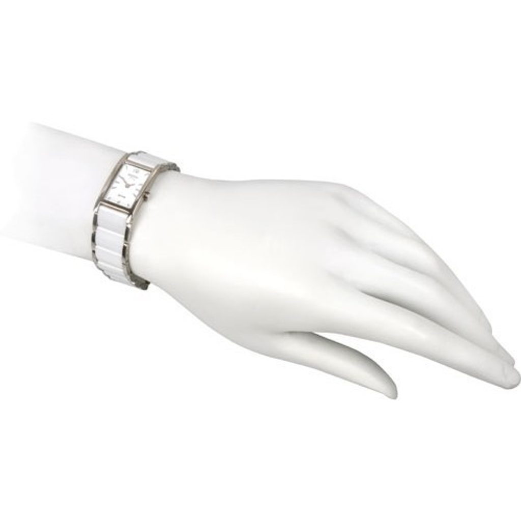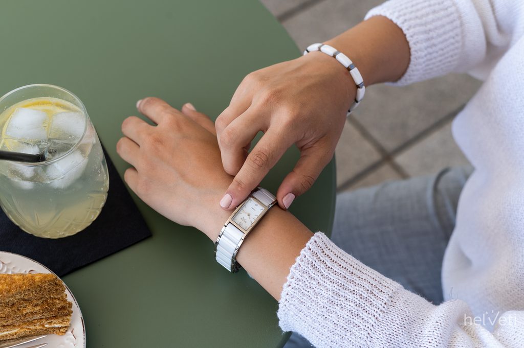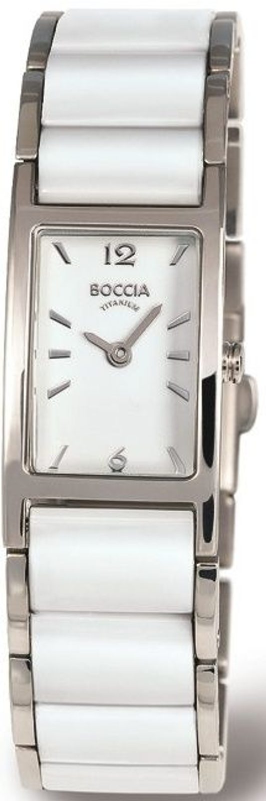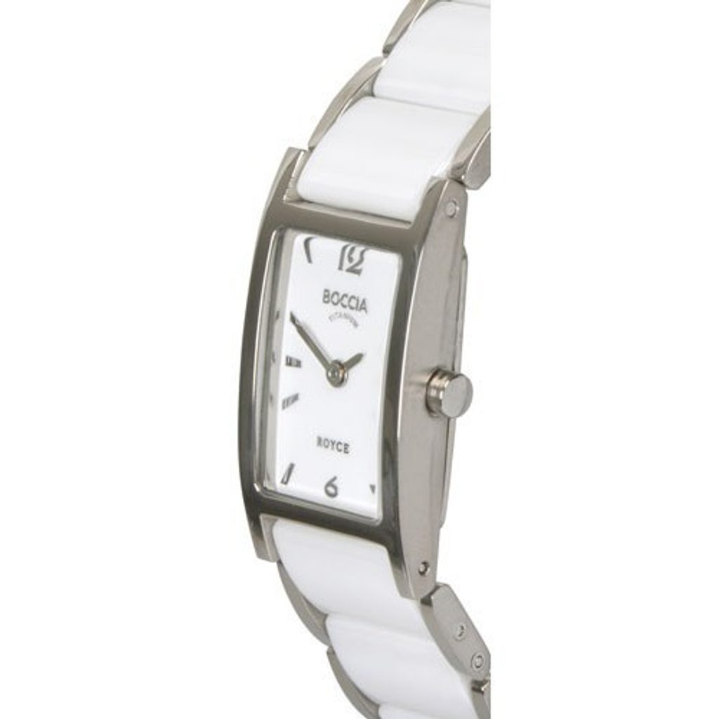 Dámske hodinky Boccia Titanium 3201-01 s puzdrom obdĺžnikového tvaru. Stred titánového ťahu je vyplnený bielymi keramickými dielmi, ktoré ladia s bielym ciferníkom.