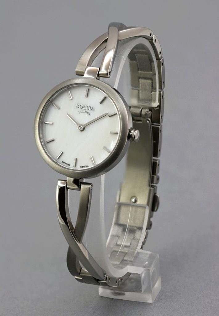 Dámske hodinky Boccia Titanium 3239-01 sú novinkou roku 2014. Majú úzky titánový ťah, ktorý je uchytený k hodinkám netradičným spôsobom. Ciferník okrúhleho tvaru chráni zafírové sklíčko.