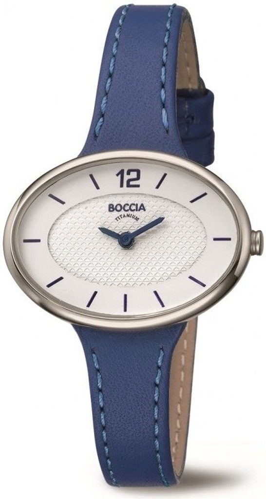 Dámske hodinky Boccia Titanium 3261-03 s elipsovitým titánovým puzdrom. Hodinky držia na ruke vďaka modrému koženému remienku. Biely ciferník je chránený minerálnym sklíčkom. Ciferník ďalej dopĺňajú modré ručičky a indexy. Vodotesnosť tohto modelu je 50 m.