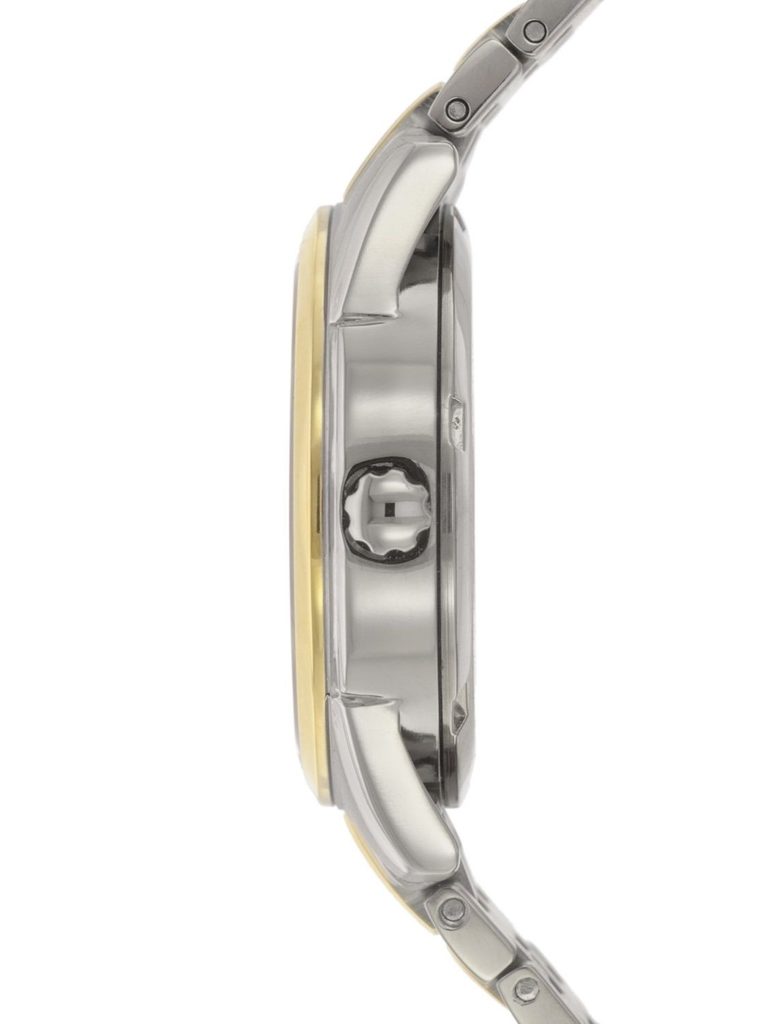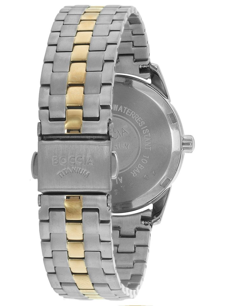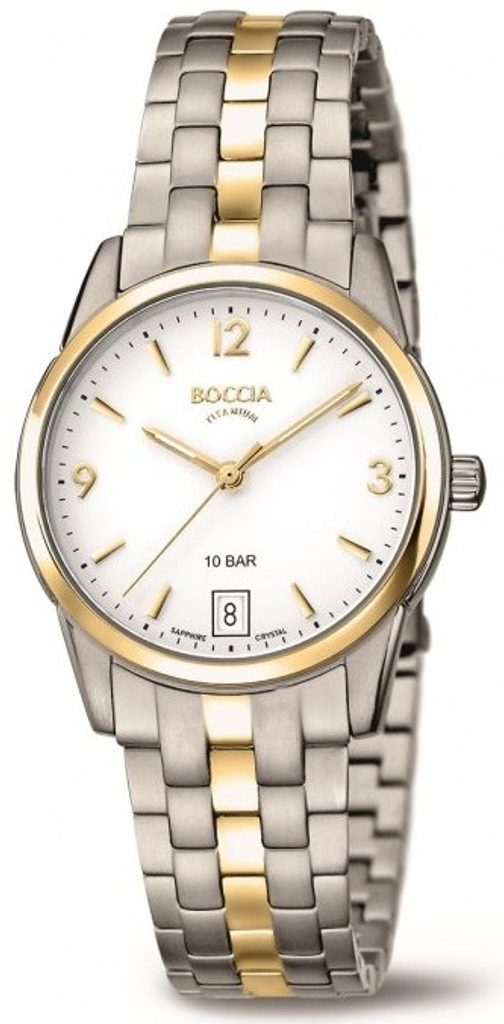 Dámske hodinky Boccia Titanium 3272-04 disponujú okrúhlym titánovým puzdrom, ktoré je doplnené titánovým náramkom, to všetko doladil výrobca zlatou úpravou PVD. Ciferník s bielym podkladom má v dolnej časti ukazovateľ dátumu.