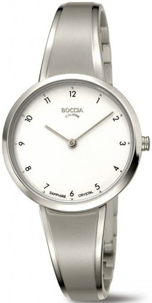 Hodinky Boccia Titanium 3325-01 sú presne to, čo by nemalo chýbať na ženskom zápästí. Hodinky, ktoré sa dajú použiť ako do spoločnosti, tak aj na bežné nosenie či do práce. Biely ciferník je chránený zafírovým sklíčkom, ktoré je vysoko odolné proti poškriabaniu. Hodinky majú vodotesnosť do30 m, čo je dostatočná hodnota na umývanie rúk alebo dážď. Vďaka titánovej konštrukcii sú hodinky veľmi ľahké a s hmotnosťou len 38 g ich na zápästí ani nepocítite. Titán je vhodný aj pre alergikov, ktorí zle znášajú látky obsiahnuté v oceli. Veľkosť puzdra 33 mm sa zaraďuje medzi stredne veľké dámske hodinky.