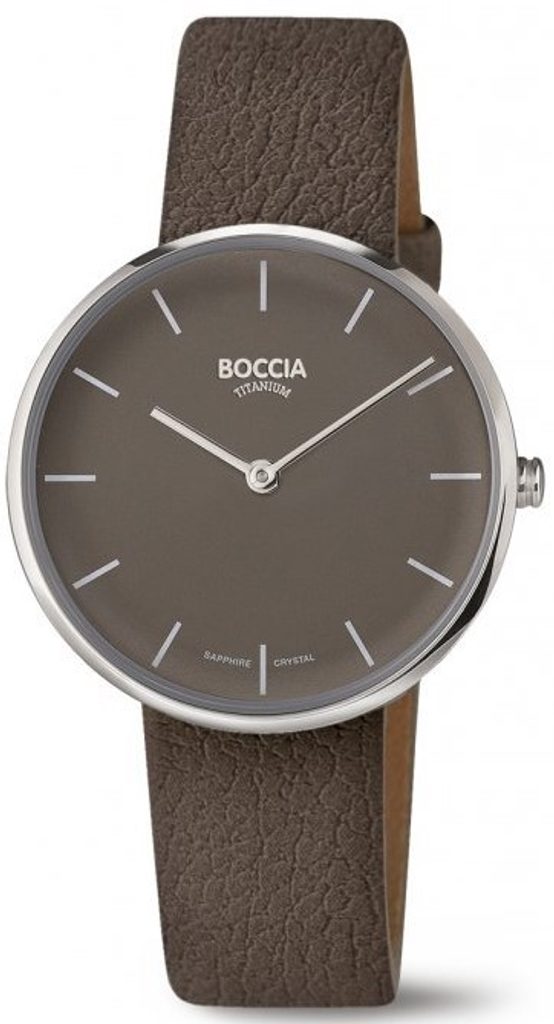 Model hodiniek Boccia Titanium 3327-02 je presne to, čo by nemalo chýbať na ženskom zápästí. V titánovom puzdre sa nachádza batériový strojček s presnosťou ±15 s/mesiac. Elegantný hnedý ciferník je chránený safírovým sklíčkom, ktoré je vysoko odolné proti poškriabaniu. Vodotesnosť modelu je 30 m, čo je dostatočné na umývanie rúk alebo do dažďa. Veľkosť puzdra 35 mm z neho robí jedny z väčších dámskych hodiniek. Na prehľadnom ciferníku nájdeme indexy, hodinky nemajú ukazovateľ dátumu. Eleganciu modelu ešte umocňuje kožený remienok z materiálu APPLESKIN. Ide o inovatívnu alternatívu bio kože vyrobenú z 50 % recyklovaného jablkového vlákna. Remienok je 100% vegánsky, odolný voči oderu a príjemný na dotyk.
