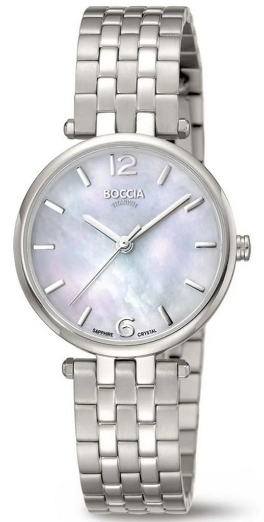 Pri modeli Boccia Titanium 3339-01 sa výrobca zameral na jednoduchosť a čistý dizajn a v tomto prípade bol opäť veľmi úspešný. Hodinky zaujmú výnimočným perleťovým ciferníkom. Pri každom pohybe ruky vás budú fascinovať neustále sa meniace trblietavé farby. Ciferník je chránený zafírovým sklíčkom, takže sa nemusíte obávať poškriabania a znehodnotenia tohto umeleckého diela.