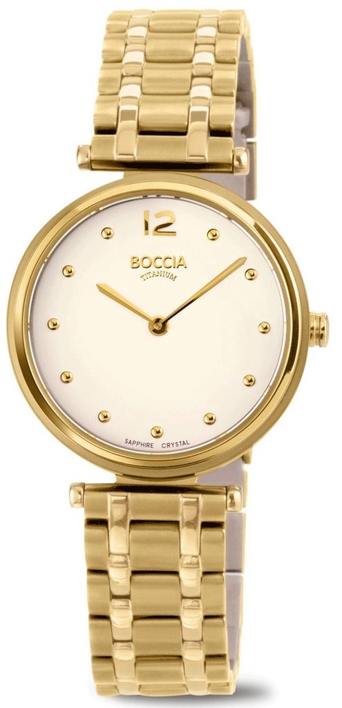 Dámske hodinky Boccia Titanium 3349-04 sú určené na všetky možné príležitosti. Hodinky sú vhodné na každodenné nosenie aj na spoločenskú udalosť. Zaujmú predovšetkým svojím jednoduchým štýlom, vďaka ktorému sú čitateľné na prvý pohľad. Model je prezentovaný v kombinácii titánového puzdra a titánového náramku, ktorého veľkosť sa dá veľmi ľahko nastaviť. Puzdro a náramok majú PVD povrchovú úpravu v zlatej farbe.